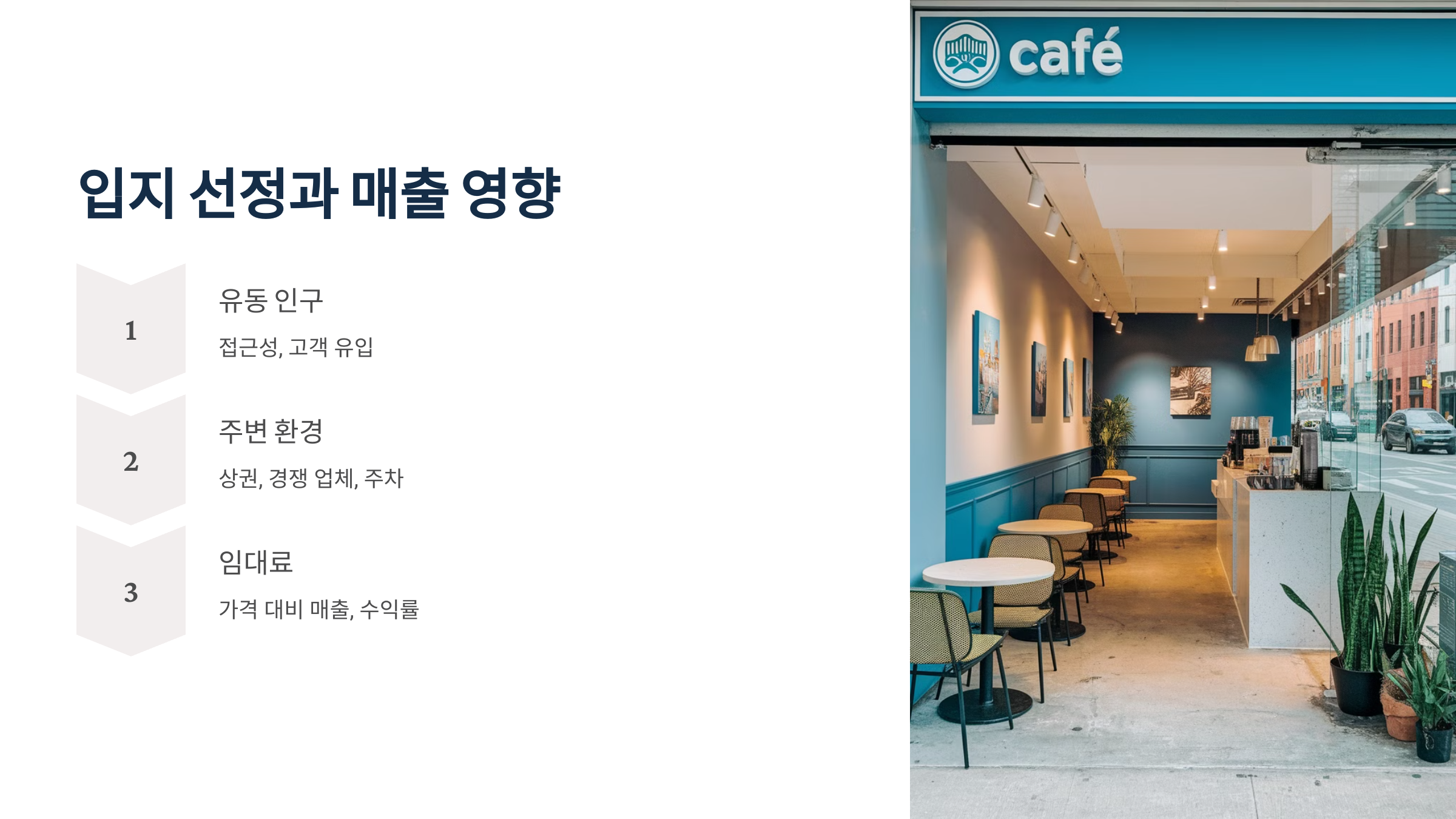 이제 카페 창업에서 가장 중요한 요소 중 하나인 입지 선정과 매출에 미치는 영향을 살펴볼게요! 📍