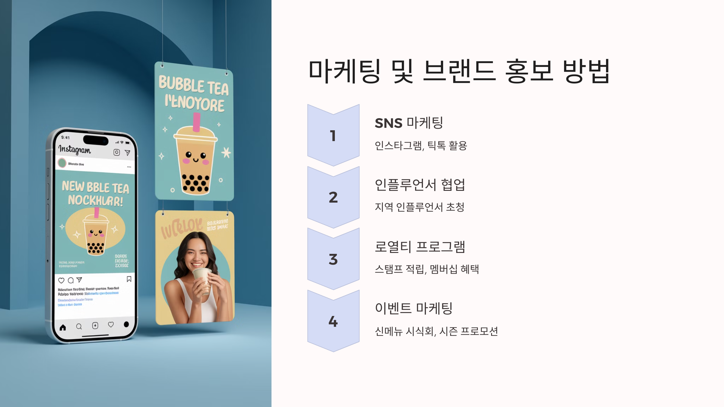 특히 버블티는 **비주얼이 중요한 음료**라서 인스타그램, 틱톡 같은 플랫폼에서 입소문을 타기 좋아요. 고객들이 사진을 찍어 자발적으로 홍보할 수 있도록 포토존을 만들거나 감성적인 디자인의 컵을 사용하는 것도 좋아요. 📸