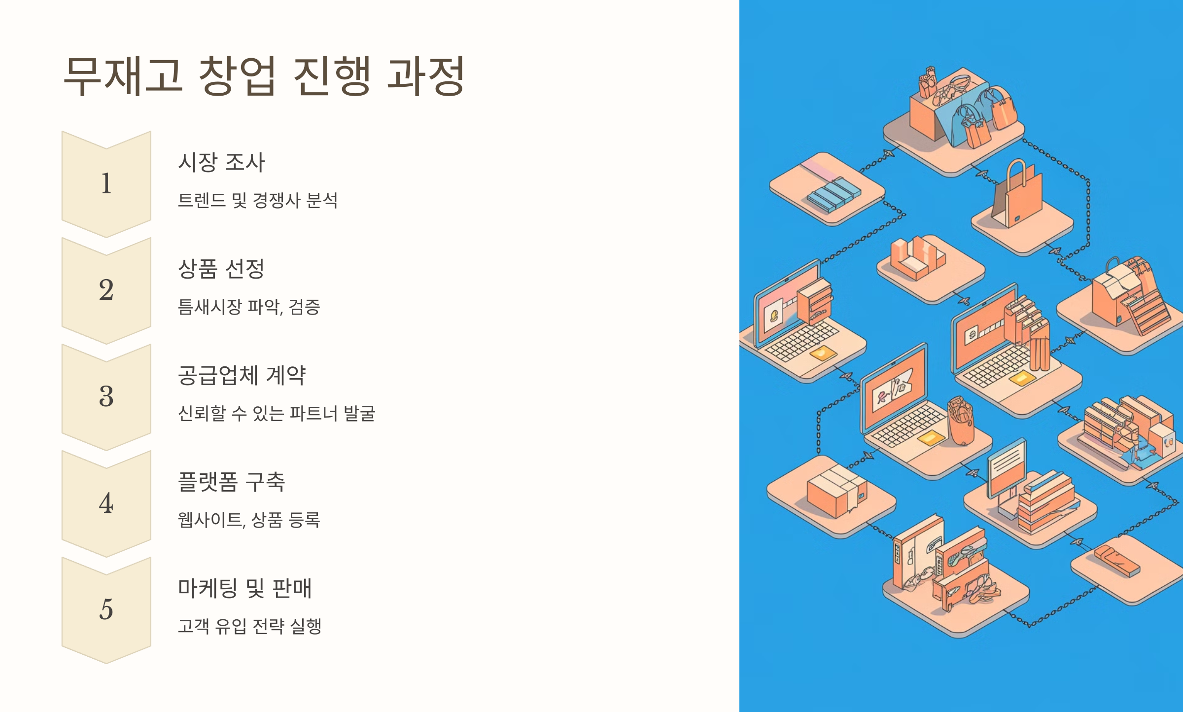 무재고 창업을 진행하는 기본적인 과정은 ① 시장 조사 → ② 제품 선정 → ③ 플랫폼 구축 → ④ 마케팅 전략 수립 → ⑤ 주문 처리 및 운영의 5단계로 정리할 수 있어요.