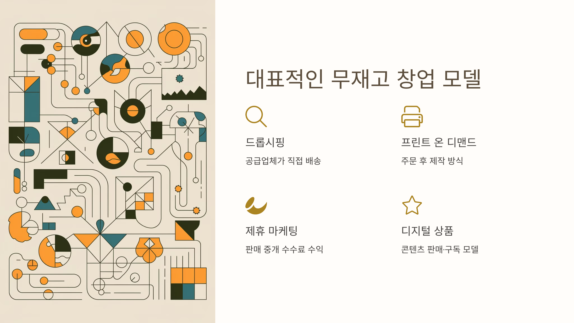 대표적인 무재고 창업 모델에는 크게 네 가지가 있어요. ① 드롭쉬핑, ② 프린트 온 디맨드, ③ 디지털 제품 판매, ④ 제휴 마케팅이에요. 각각의 모델을 자세히 살펴볼게요!