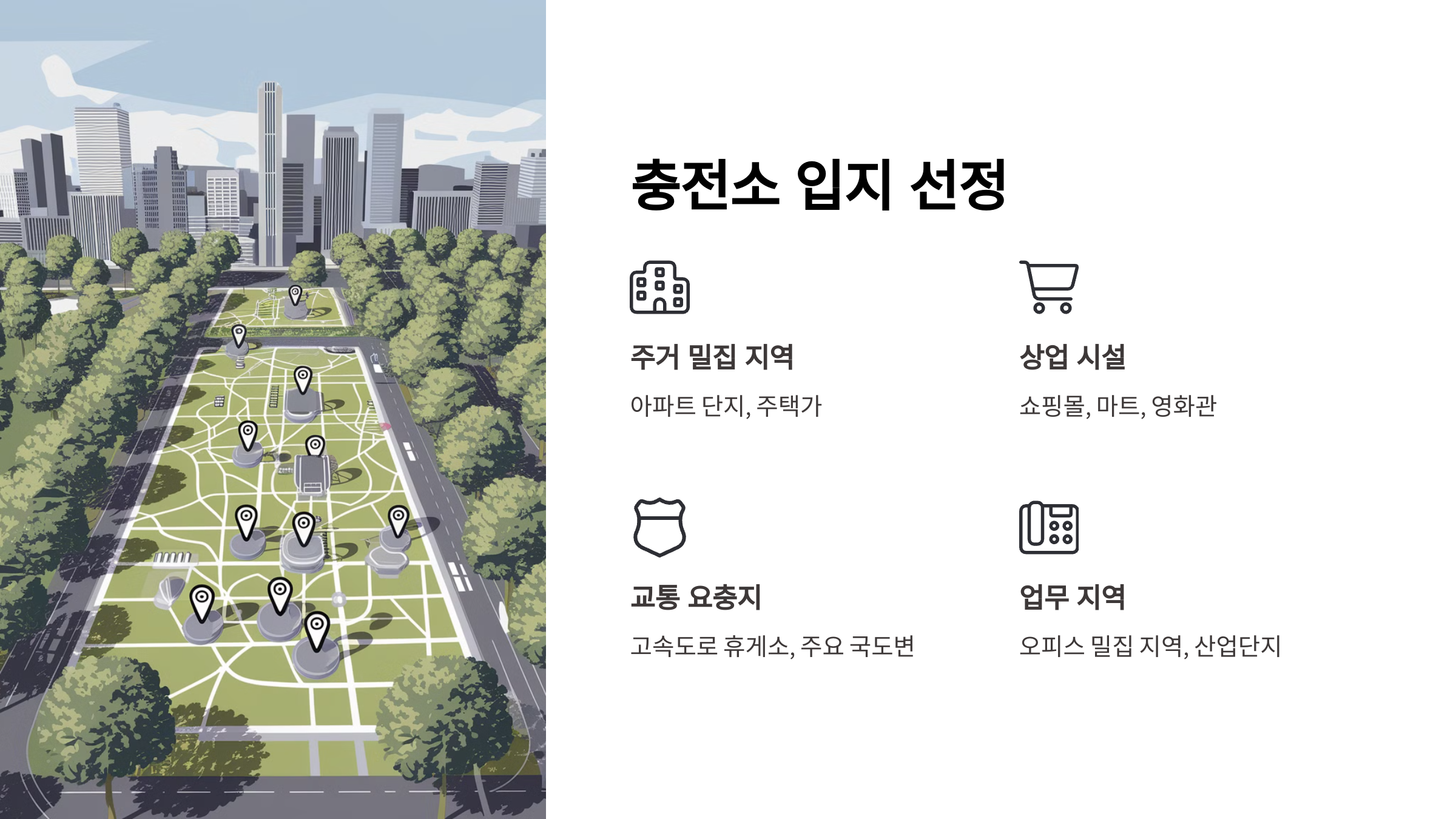 | 아파트 & 주거 단지 | 입주민 전용 충전소 운영 | 꾸준한 수요 확보 가능 |
