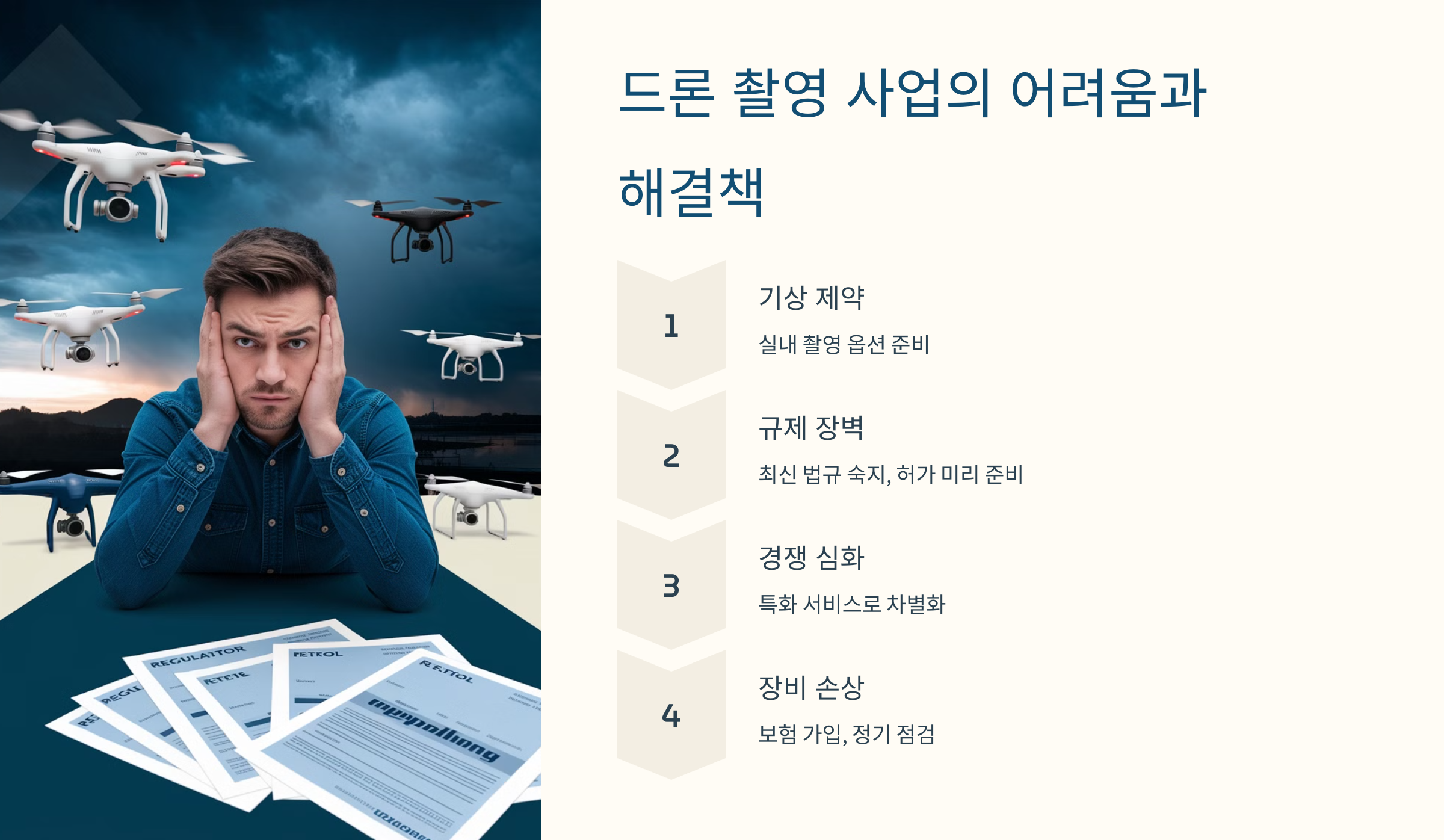 이제 드론 촬영 사업에서 발생할 수 있는 **어려움과 해결책**을 알아볼 차례예요! ⚠️