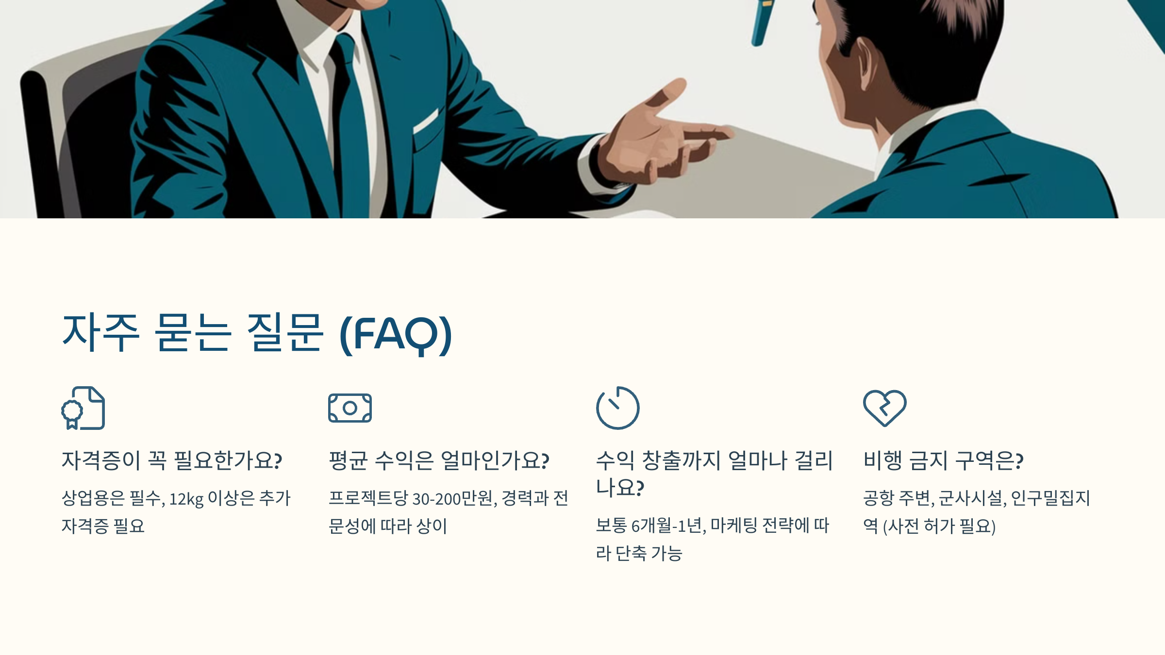 초기 비용을 줄이려면 **렌탈 장비 활용, 중고 드론 구매, 개인 영업 위주 운영**을 고려할 수 있어요. 💡
