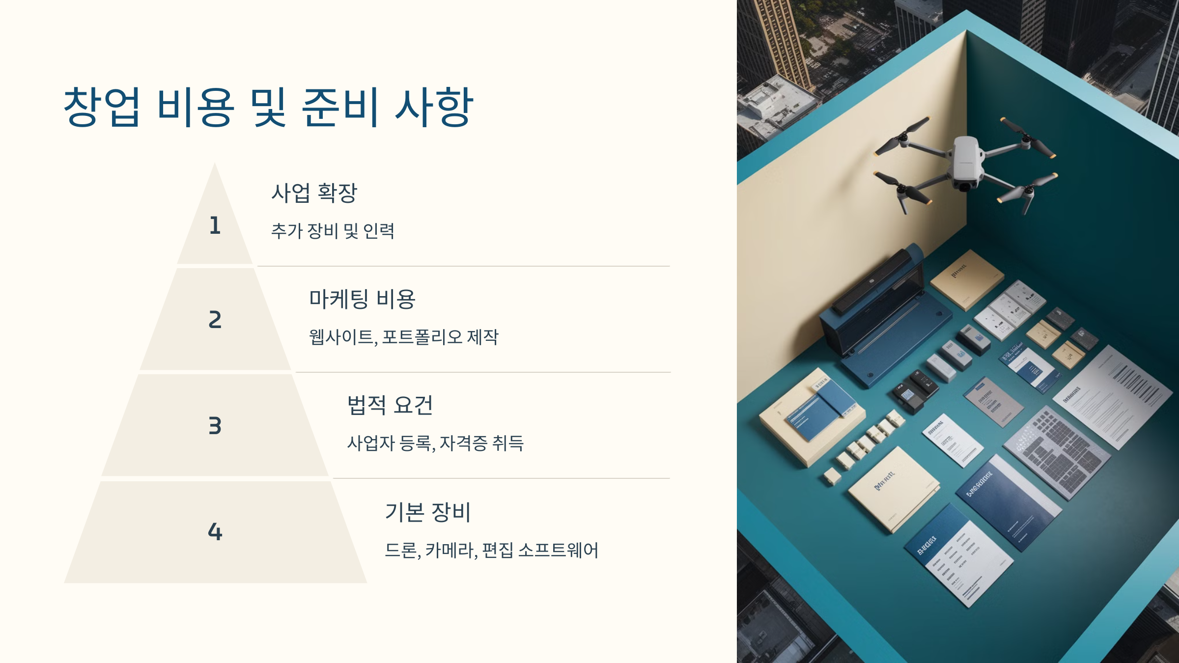 초기 비용은 **드론 장비, 촬영 장비, 자격증, 마케팅, 영업 비용** 등에 따라 달라져요. 📌