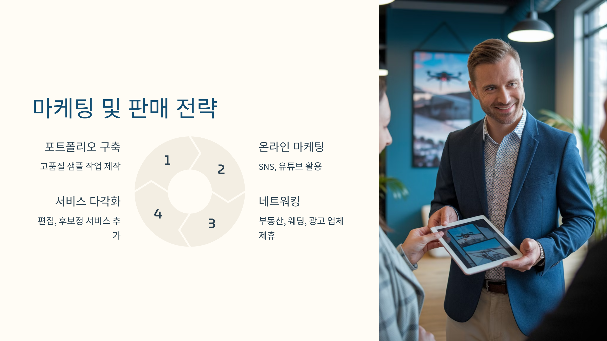 이제 드론 촬영 사업의 핵심인 **마케팅 & 판매 전략**을 알아볼 차례예요! 🚀