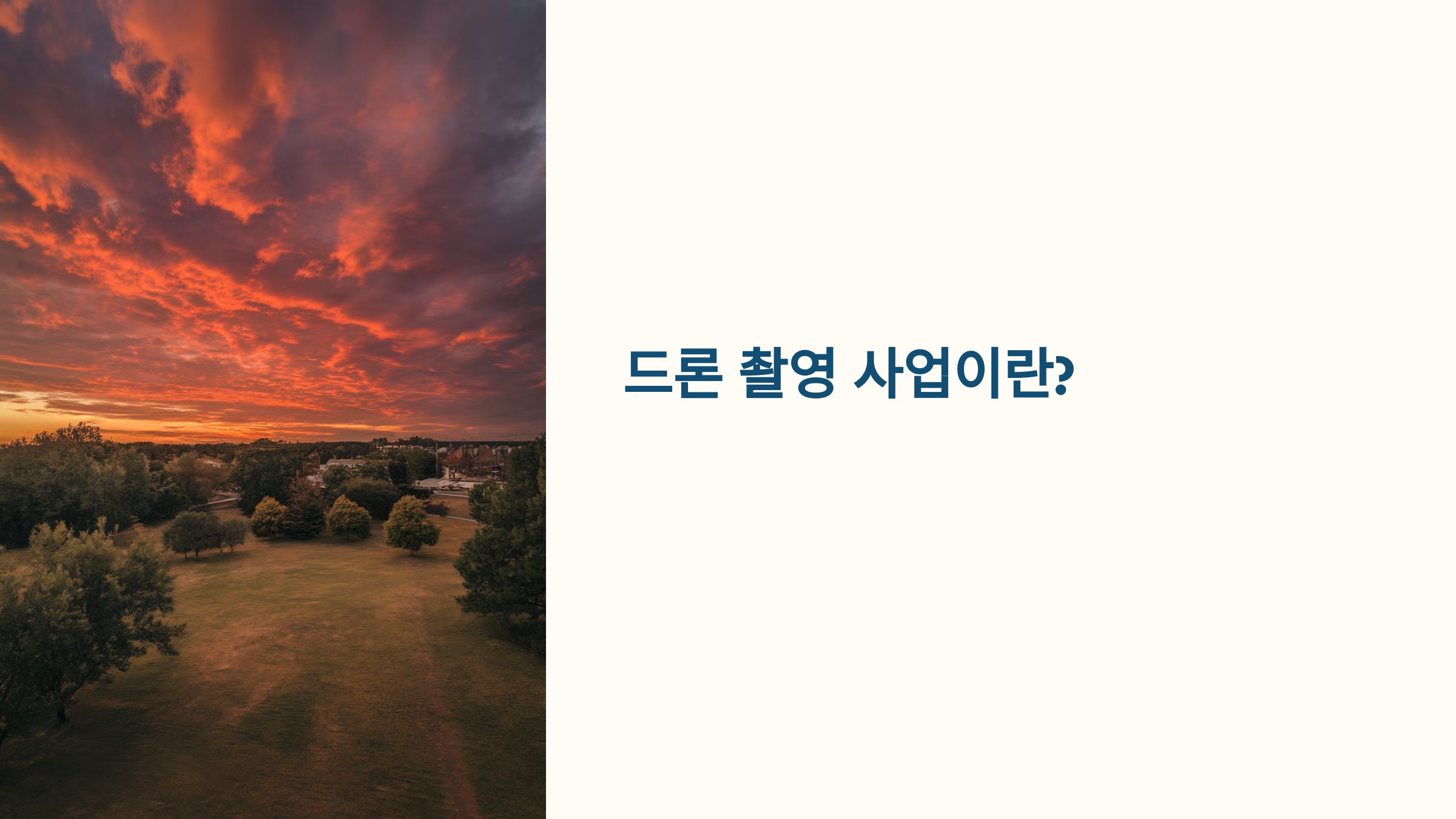 드론 촬영 사업은 **드론을 이용해 고품질의 항공 사진과 영상을 촬영하는 서비스**를 제공하는 사업이에요. 과거에는 헬리콥터나 비행기를 이용해야 했지만, **드론 기술이 발전하면서 저렴한 비용으로 항공 촬영이 가능**해졌어요. 🚁📷