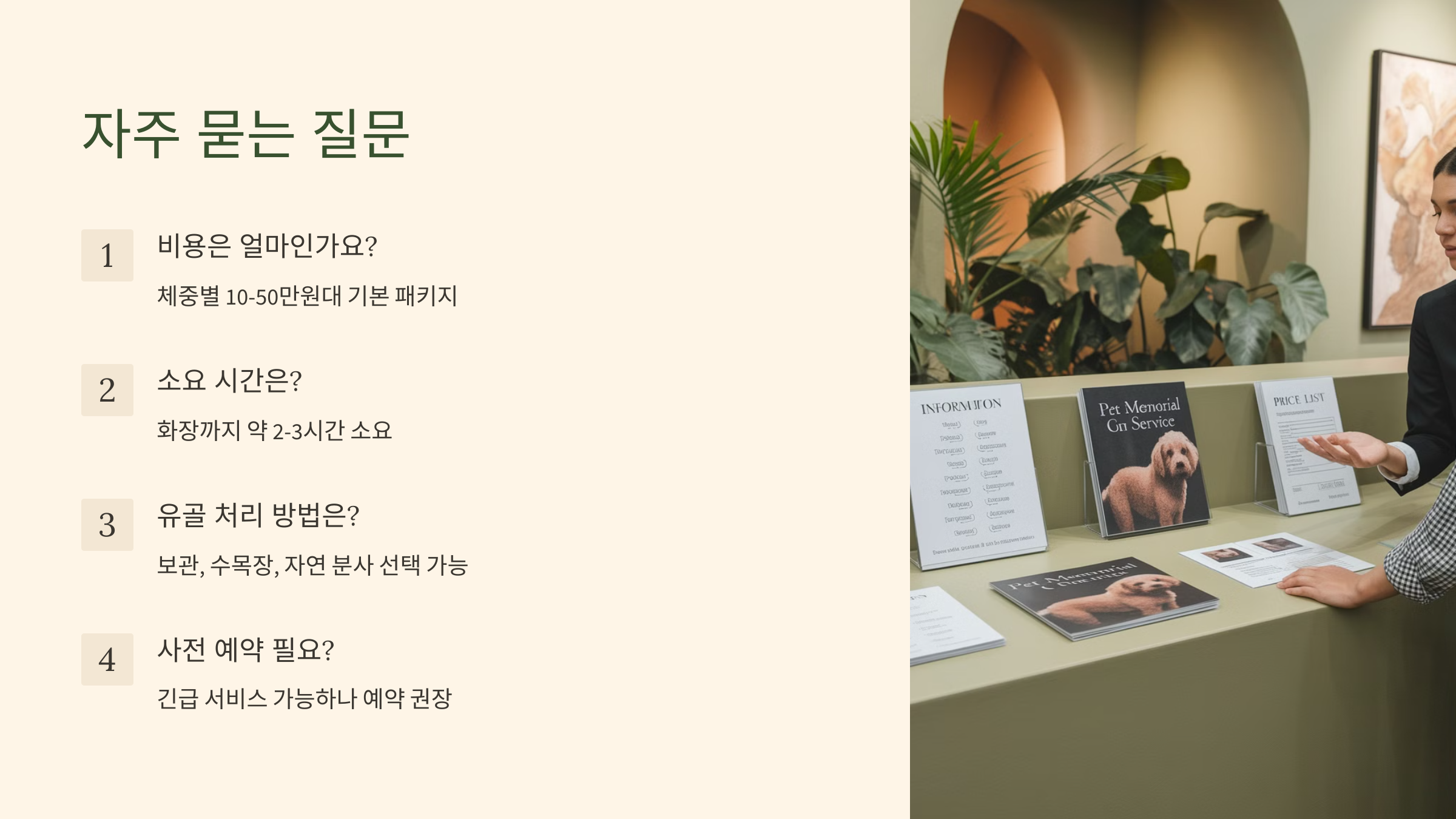 A4. 소형견/고양이 기준 20~50만 원, 대형견의 경우 70~150만 원 수준이에요. 추가적으로 유골 보관, 추모 공간 이용 시 비용이 더 들 수 있어요.