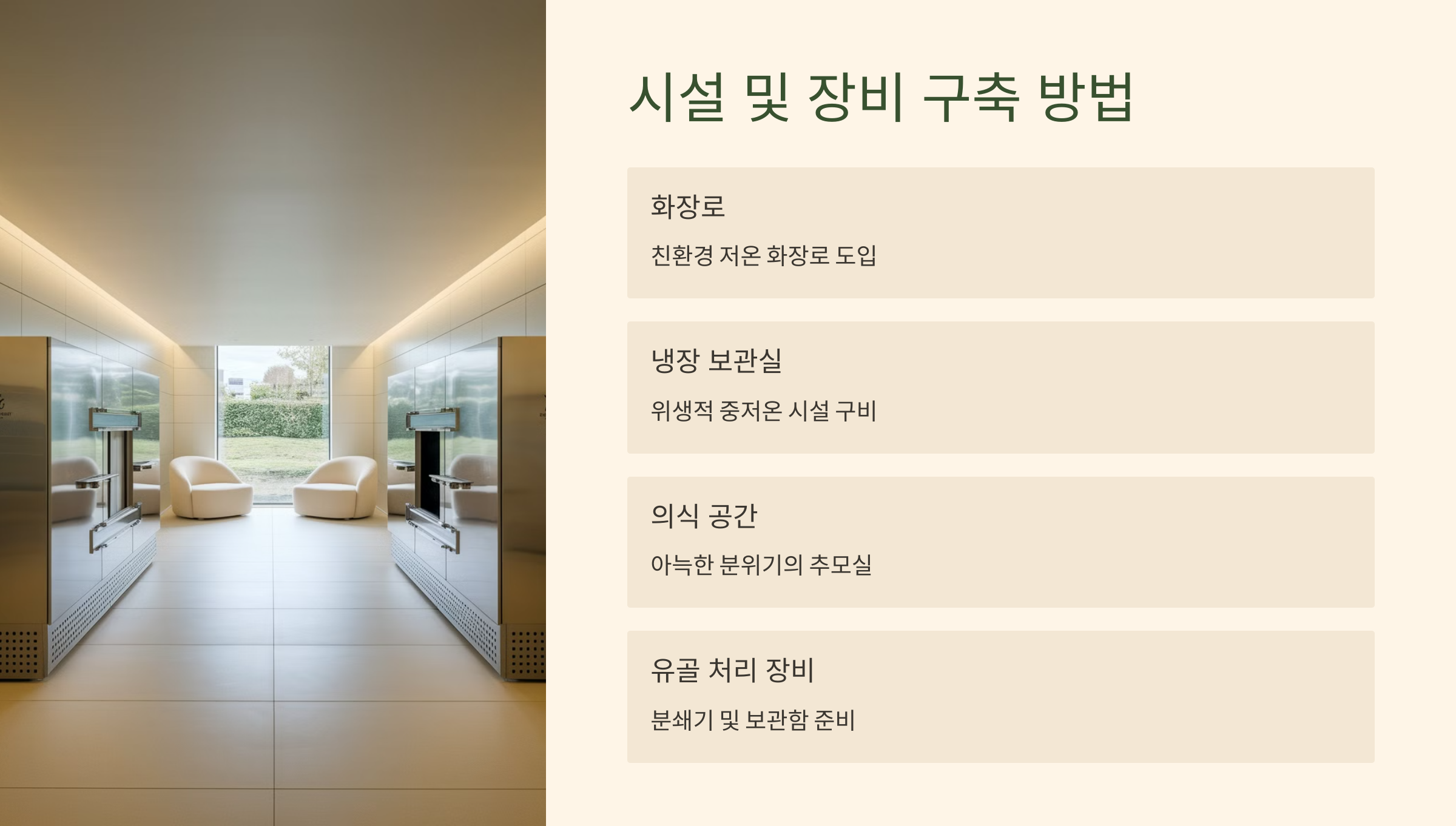 3️⃣ 유골 보관 및 기념품 제작 장비: 유골함, 수목장 부지, 유골 보석 가공 장비 등을 갖추면 차별화된 서비스를 제공할 수 있어요.