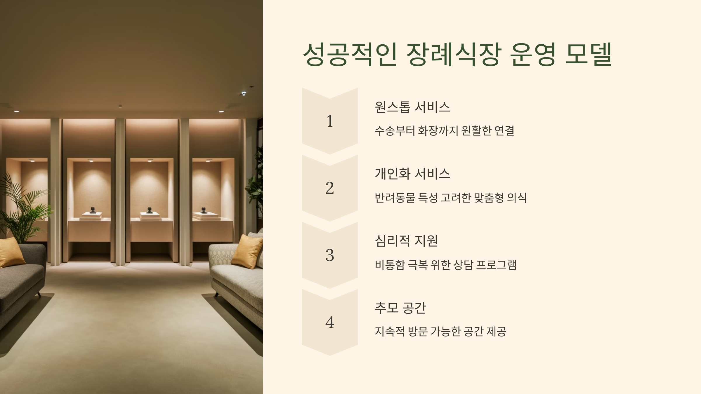 반려동물 장례식장은 단순히 화장 서비스를 제공하는 곳이 아니라, 보호자의 마음을 위로하는 공간이 되어야 해요. 다양한 운영 모델을 활용하면 차별화된 장례 서비스를 제공할 수 있어요. 🌿