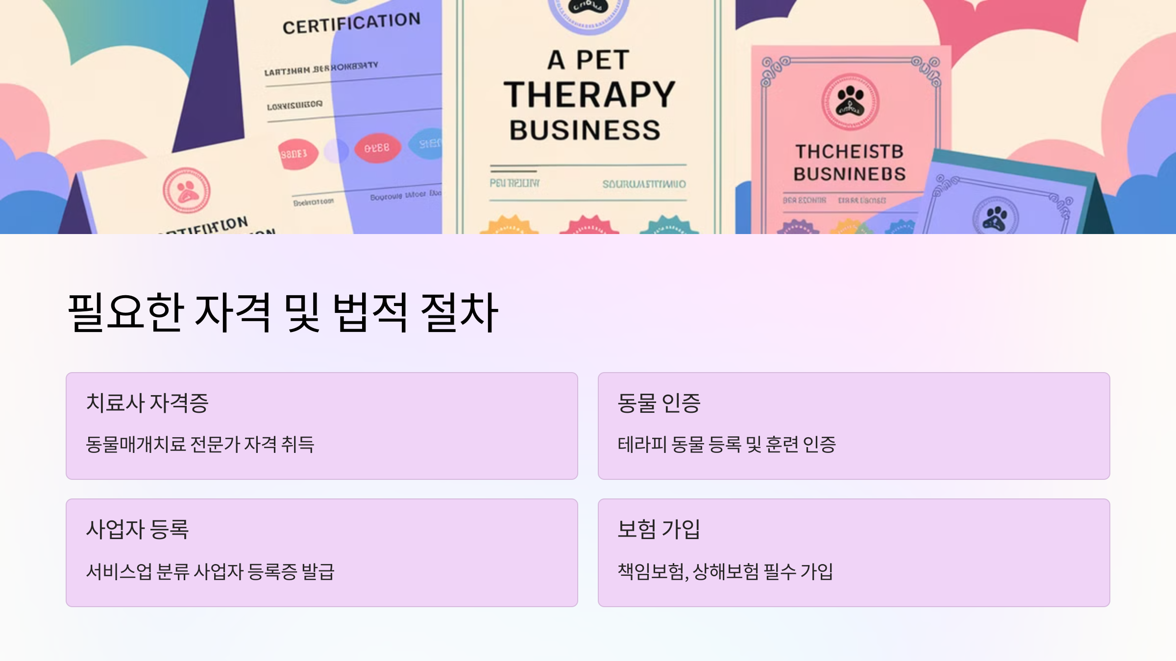 펫 테라피 사업을 운영하려면 관련 자격과 법적 절차를 충족해야 해요. 동물을 이용한 치료 활동이므로 동물 복지와 이용자의 안전을 고려한 허가 절차가 필요해요. 📜