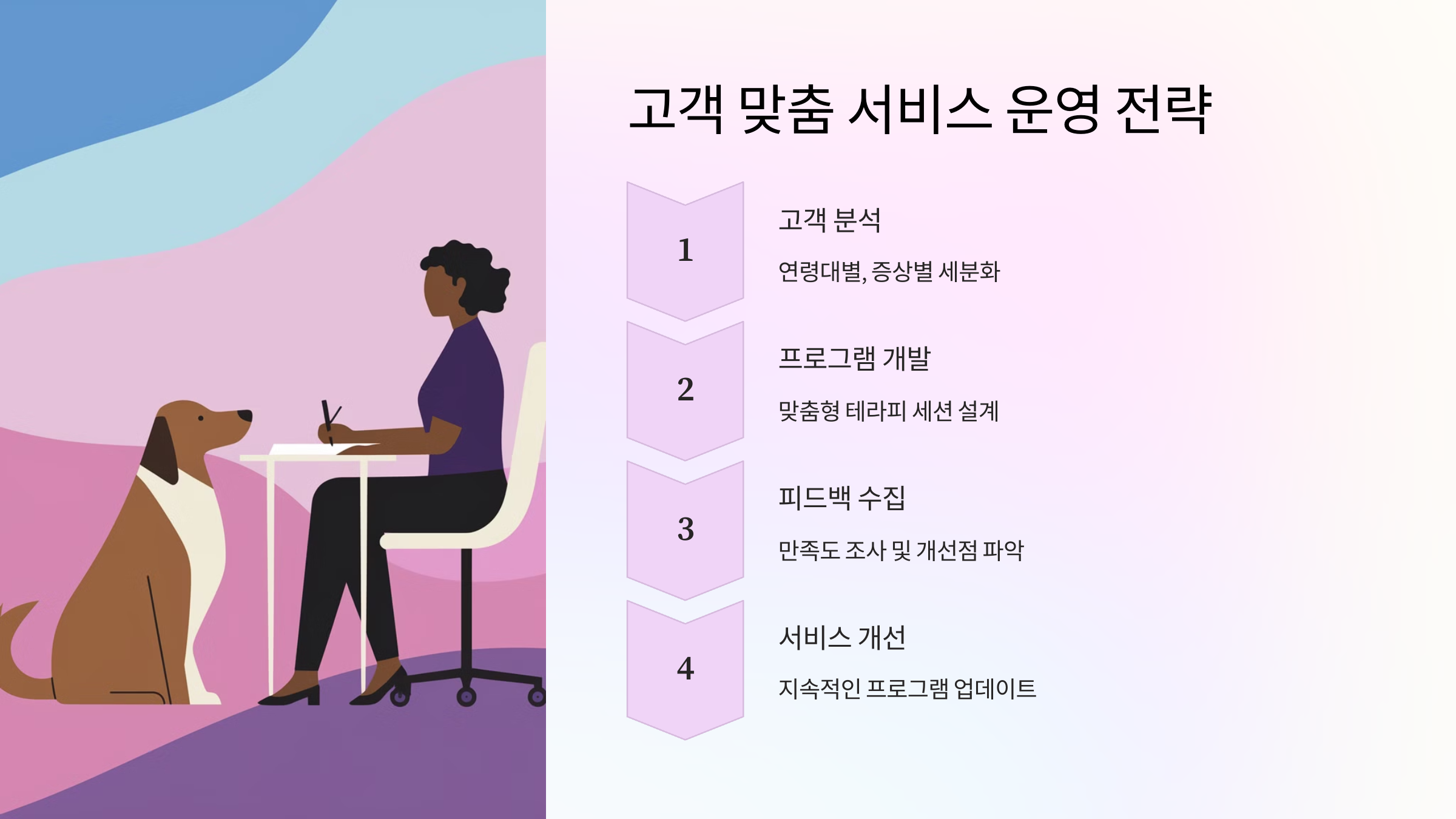 펫 테라피 센터의 성공은 고객 맞춤형 서비스에 달려 있어요. 보호자의 니즈를 반영하고, 개별적인 케어 프로그램을 제공하면 만족도를 높일 수 있어요. 🐶💖