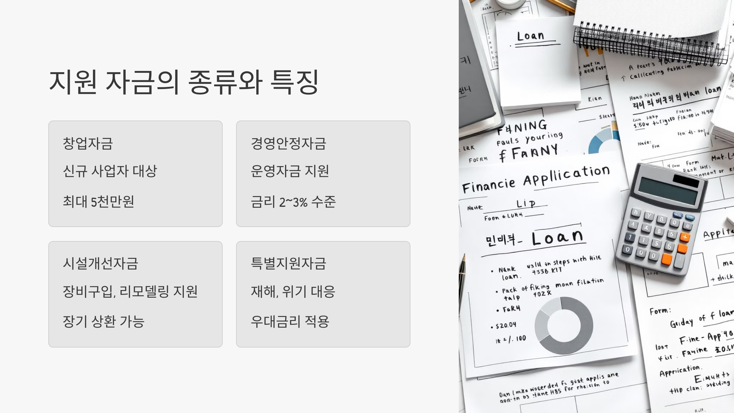 이 정책자금은 창업자금, 경영안정자금, 시설자금 등으로 세분화되어 있어요. 매장 리뉴얼, 장비 구매, 신규 창업, 긴급 운영자금 등 다양한 용도로 활용할 수 있어요.
