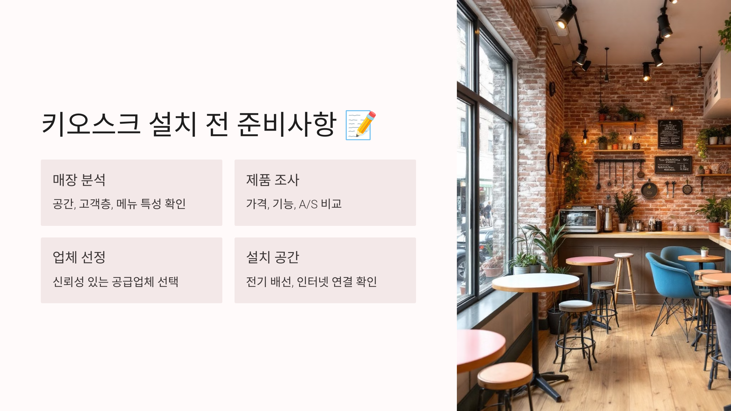 키오스크 설치를 결정했다면, 사전에 몇 가지를 체크해야 해요. 첫 번째는 ‘매장 규모와 동선 파악’이에요. 키오스크는 고객이 쉽게 접근할 수 있어야 하므로 입구, 카운터 근처 등 설치 위치를 사전에 계획해야 해요. 공간이 좁은 소형 매장은 테이블형 키오스크나 벽걸이형도 고려해요.