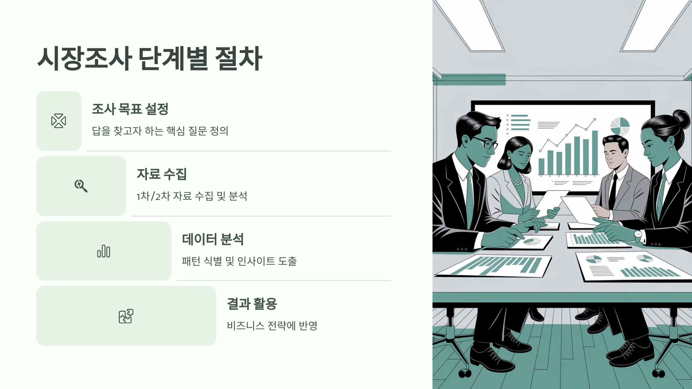 시장조사는 단계별로 체계적으로 진행하는 것이 좋아요. 막연하게 조사하지 말고, 단계마다 목표를 분명히 설정하면 효율적인 결과를 얻을 수 있어요!