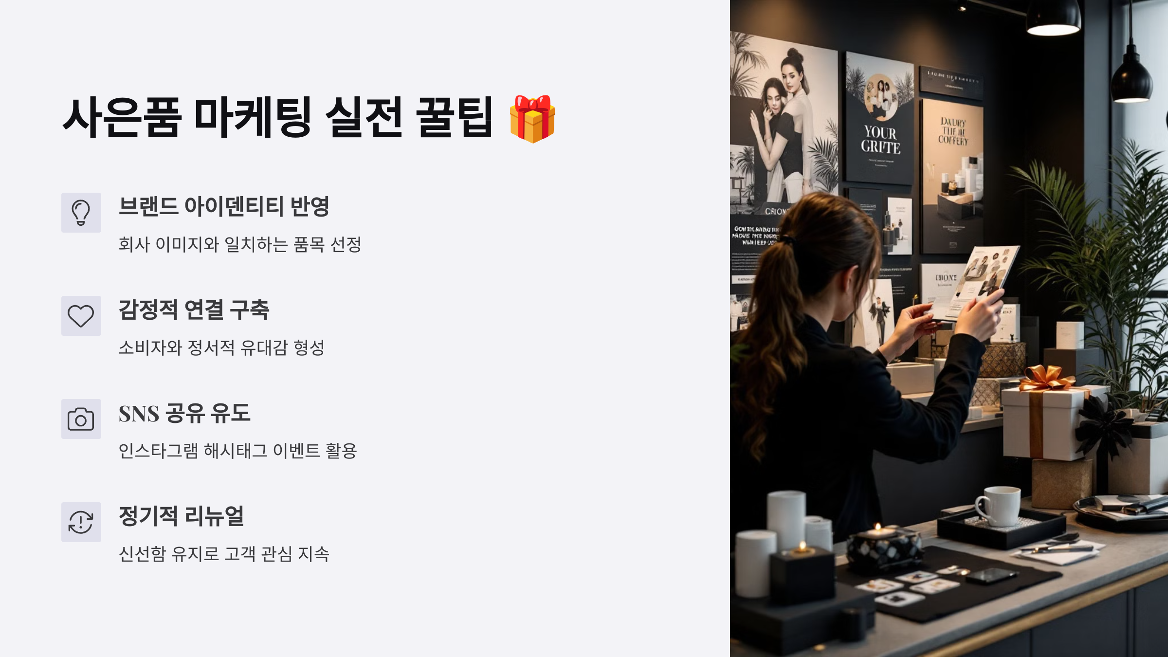 사은품은 무조건 많이 주는 것보다 ‘어떻게 주느냐’가 훨씬 중요해요! 전략적으로 활용하면 고객의 반응이 확 달라져요 😊