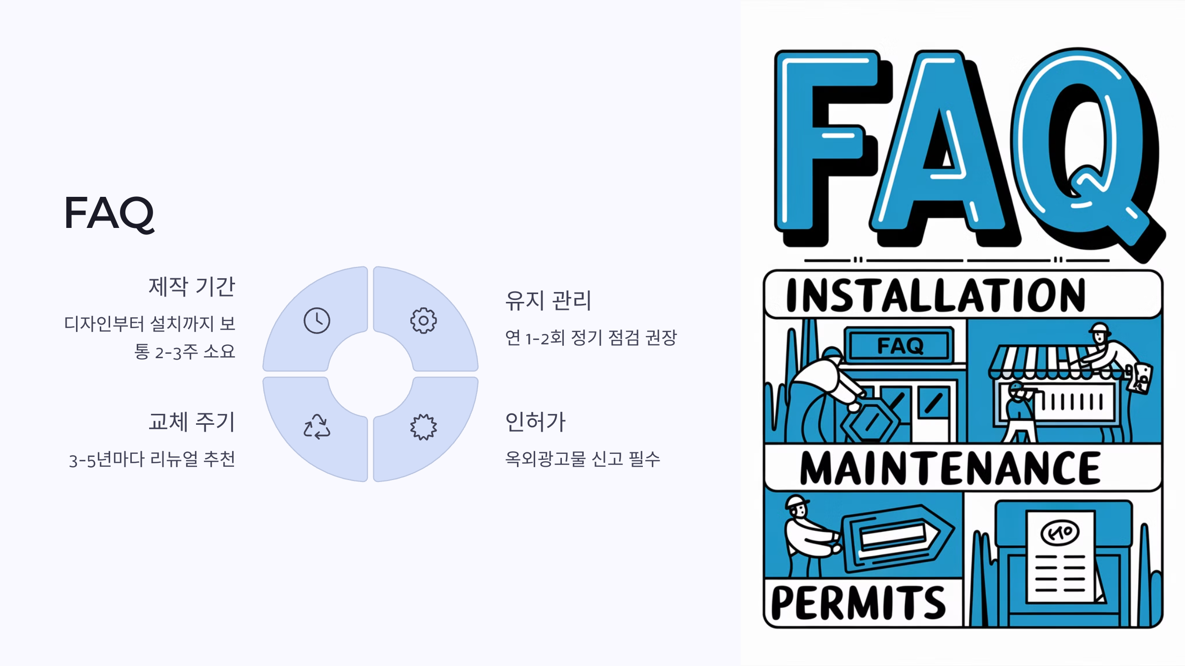A2. 디자인 확정 후 평균 7~14일 정도 소요돼요. 복잡한 구조나 대형 간판은 더 오래 걸릴 수 있어요.