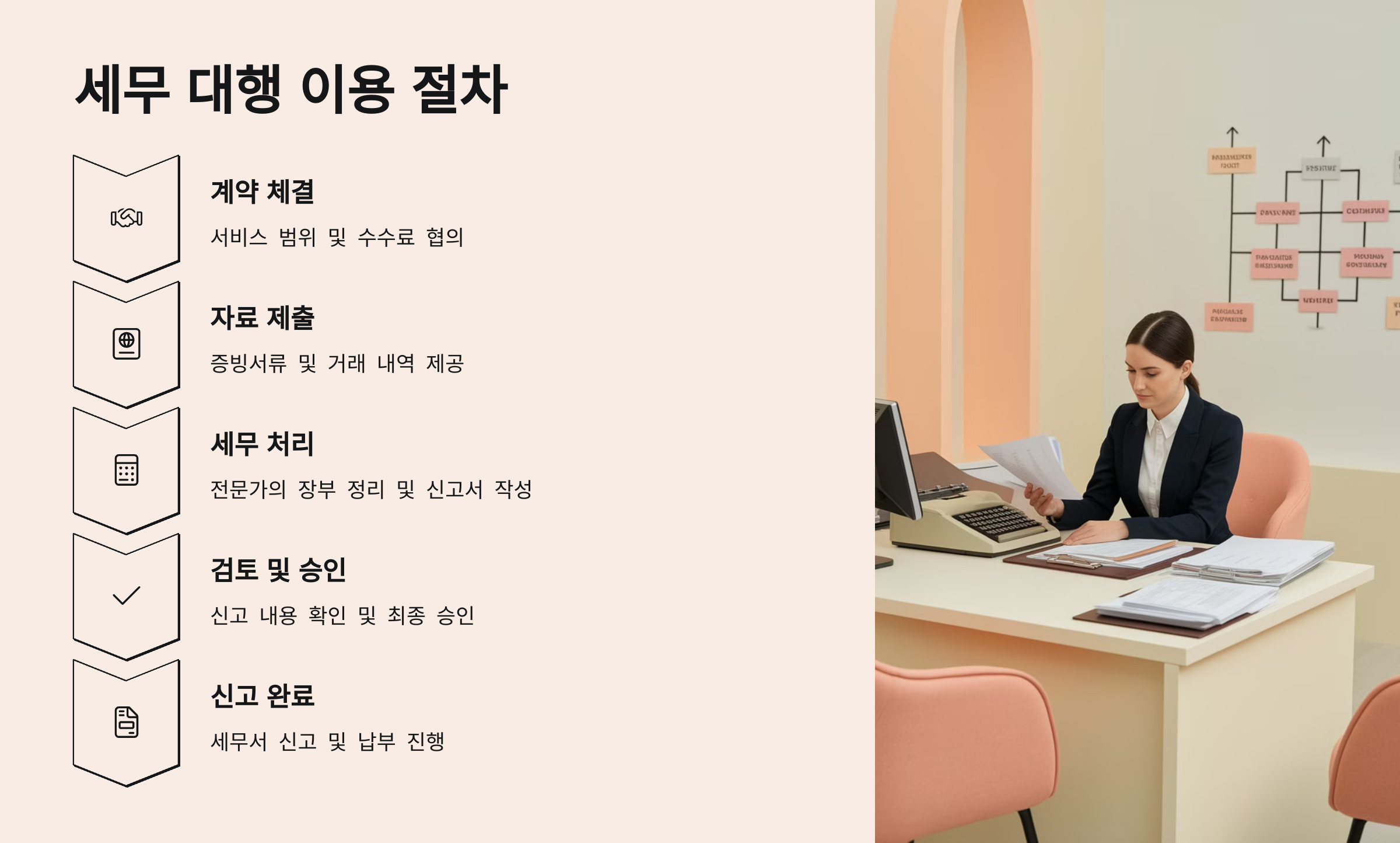 세무 대행 서비스는 어렵지 않게 이용할 수 있어요! 대부분 아래와 같은 간단한 절차로 진행돼요 😊