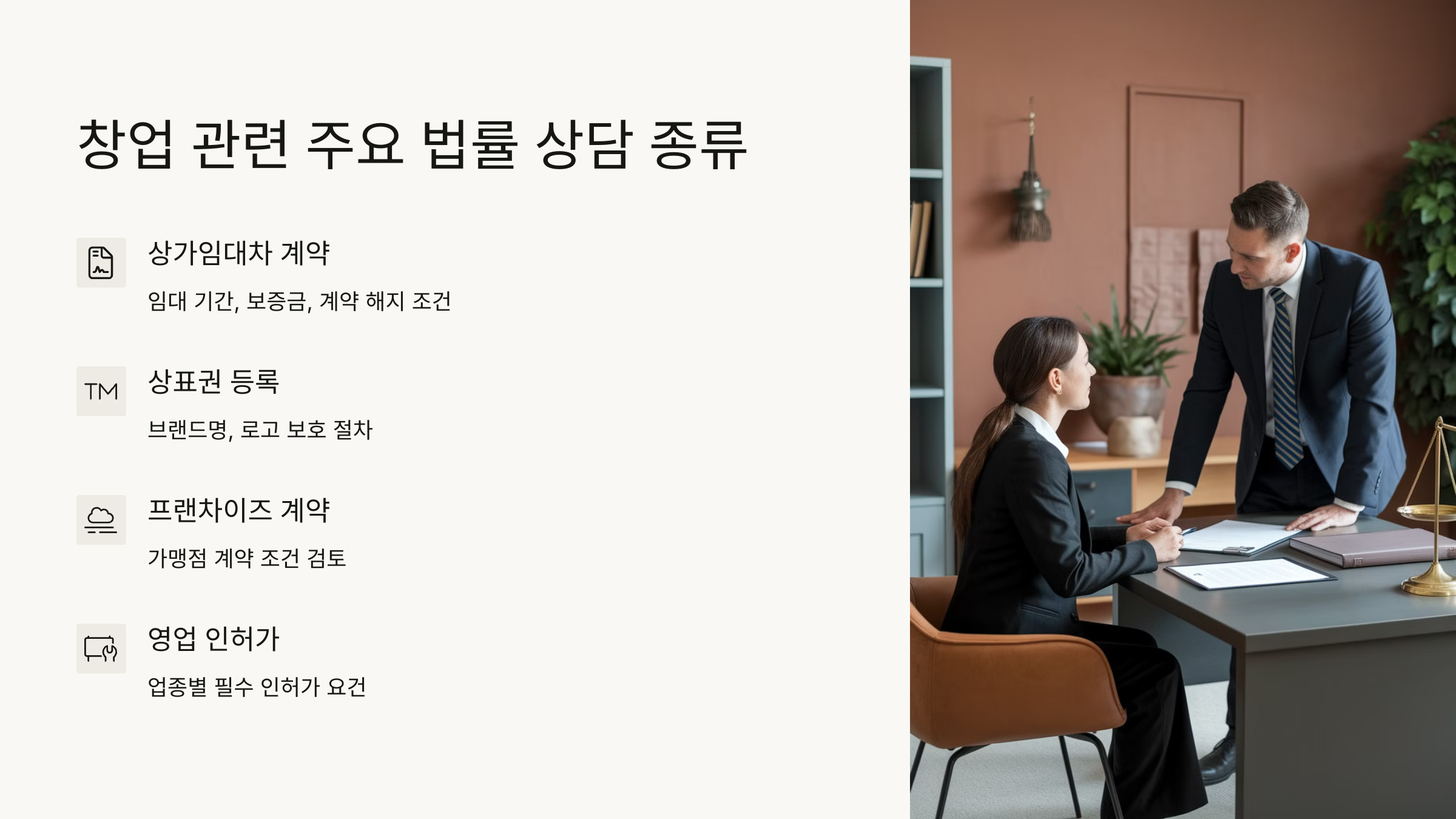 다음으로 ‘창업 관련 주요 법률 상담 종류’를 소개할게요! 🚀