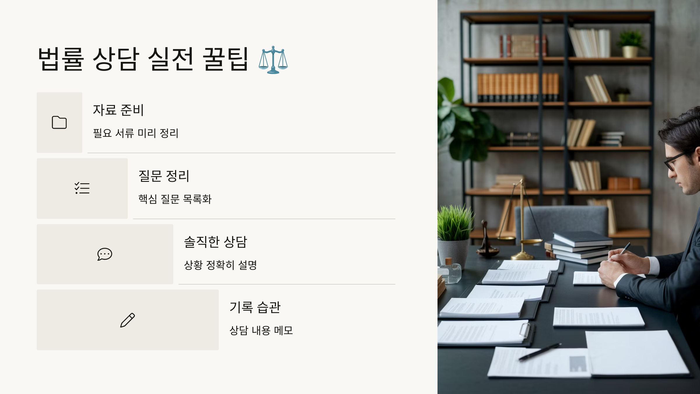 다음으로는 실전에서 바로 써먹을 수 있는 ‘법률 상담 꿀팁’ 알려드릴게요! ⚖️