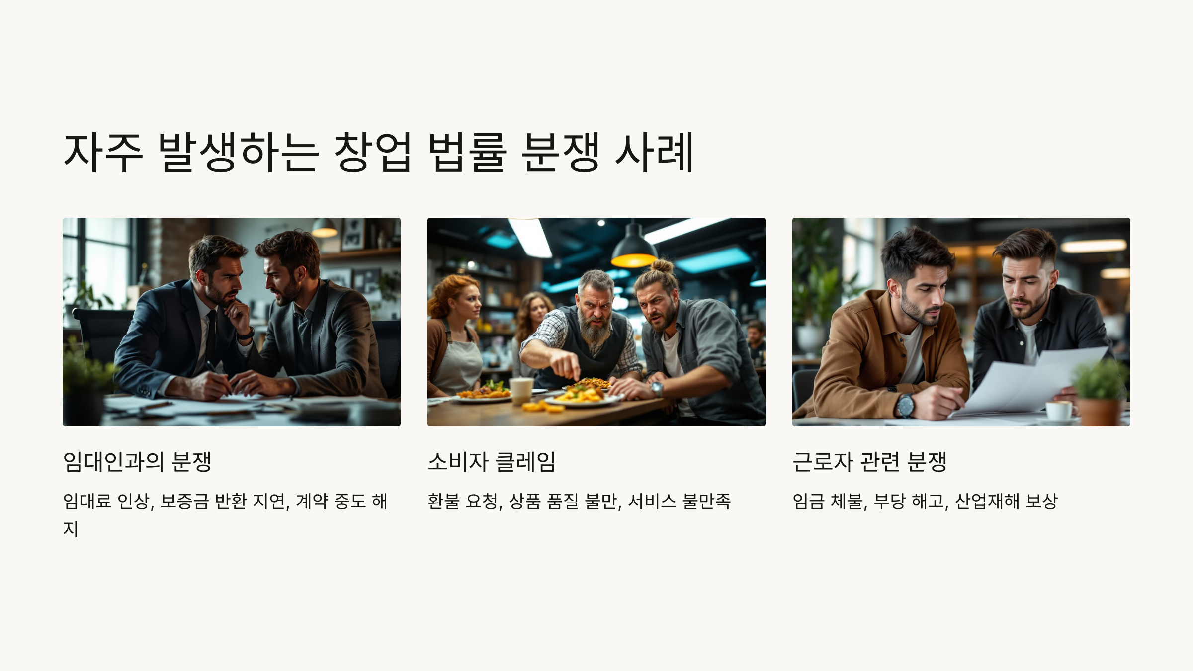 창업 현장에서 실제로 많이 발생하는 분쟁 사례들을 알아두면, 같은 실수를 예방할 수 있어요! 소상공인 분들이 흔히 겪는 법률 문제 몇 가지를 소개할게요 😊