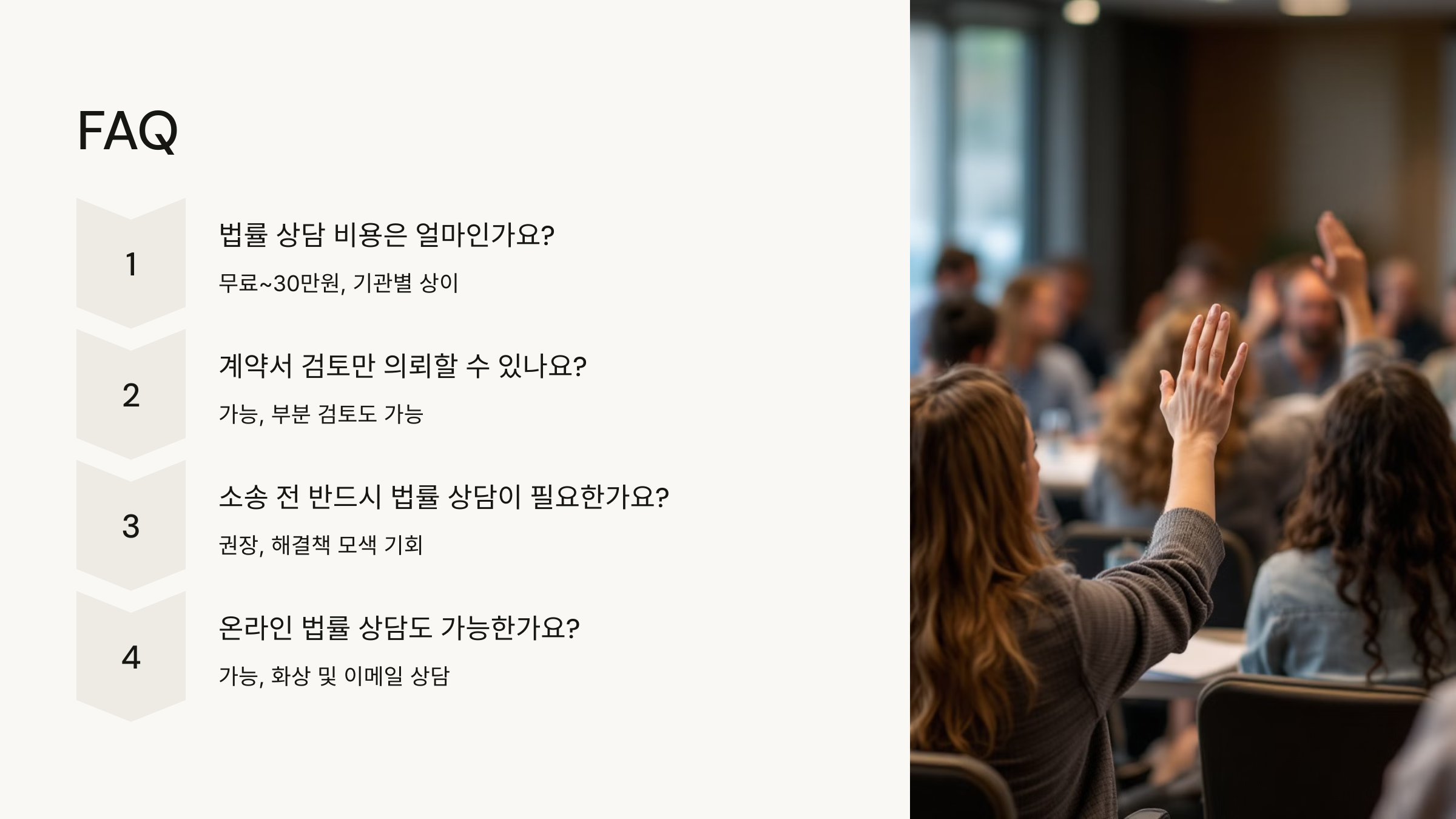 최근에는 온라인 무료 상담 플랫폼이나 소상공인 지원센터에서도 법률 상담 서비스를 제공하고 있어서 접근이 훨씬 쉬워졌어요!