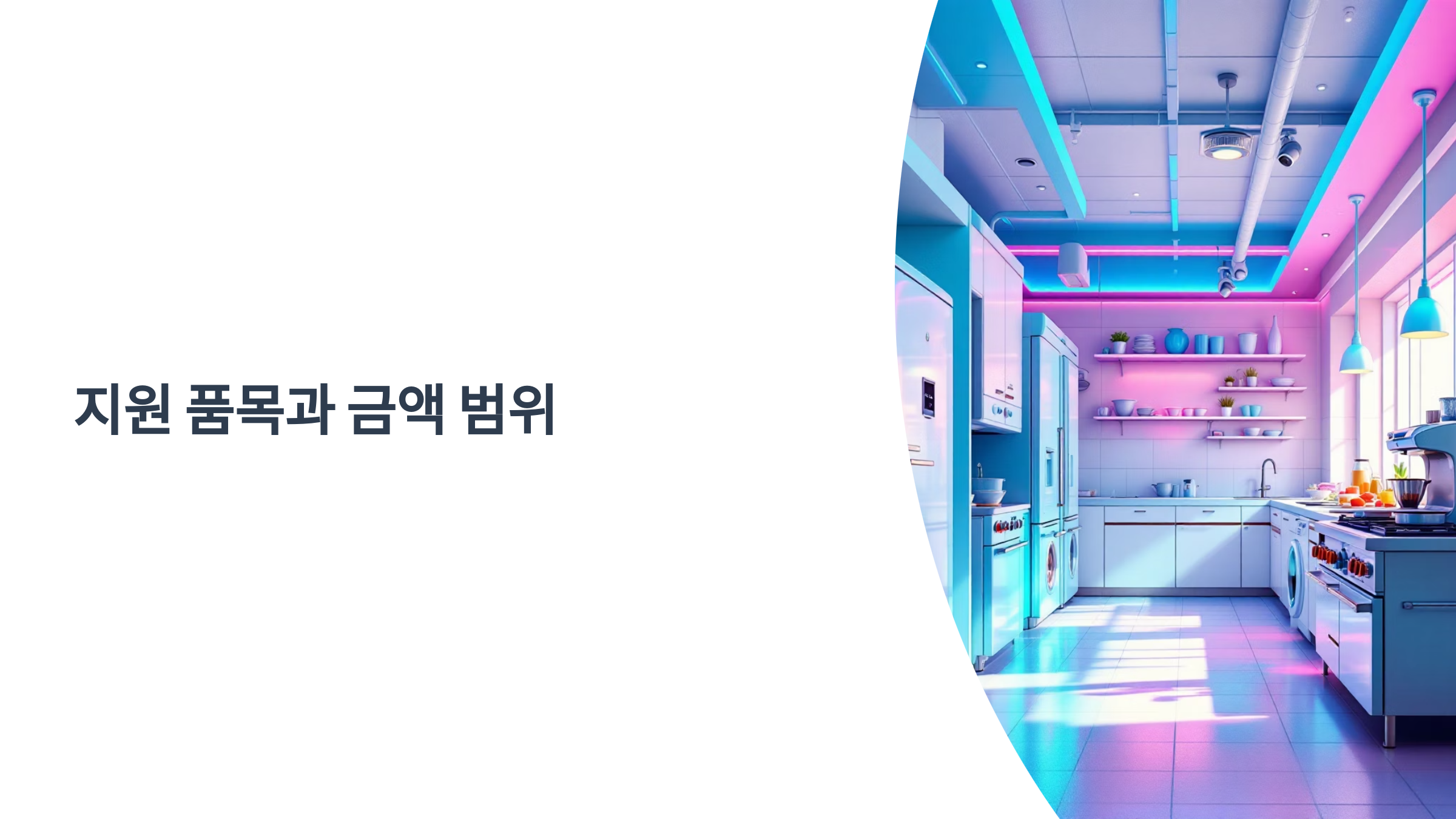 A4. 가스렌지, 냉장고, 튀김기, 식기세척기, 환풍기, 위생설비 등 조리와 위생 관련 설비가 주 대상이에요. 지역마다 세부 품목은 달라요.