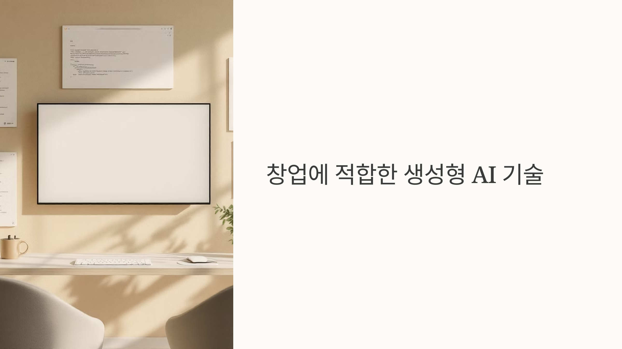 생성형 AI는 종류가 다양해서 어떤 기술을 창업에 활용해야 할지 처음에는 막막할 수 있어요. 하지만 실제 창업자들이 많이 사용하는 기술은 꽤 정해져 있어요. 중요한 건 '기술이 멋진가'가 아니라 '기술이 사업에 적합한가'예요. 그래서 이 섹션에서는 창업에 딱 맞는 생성형 AI 기술들을 소개할게요.