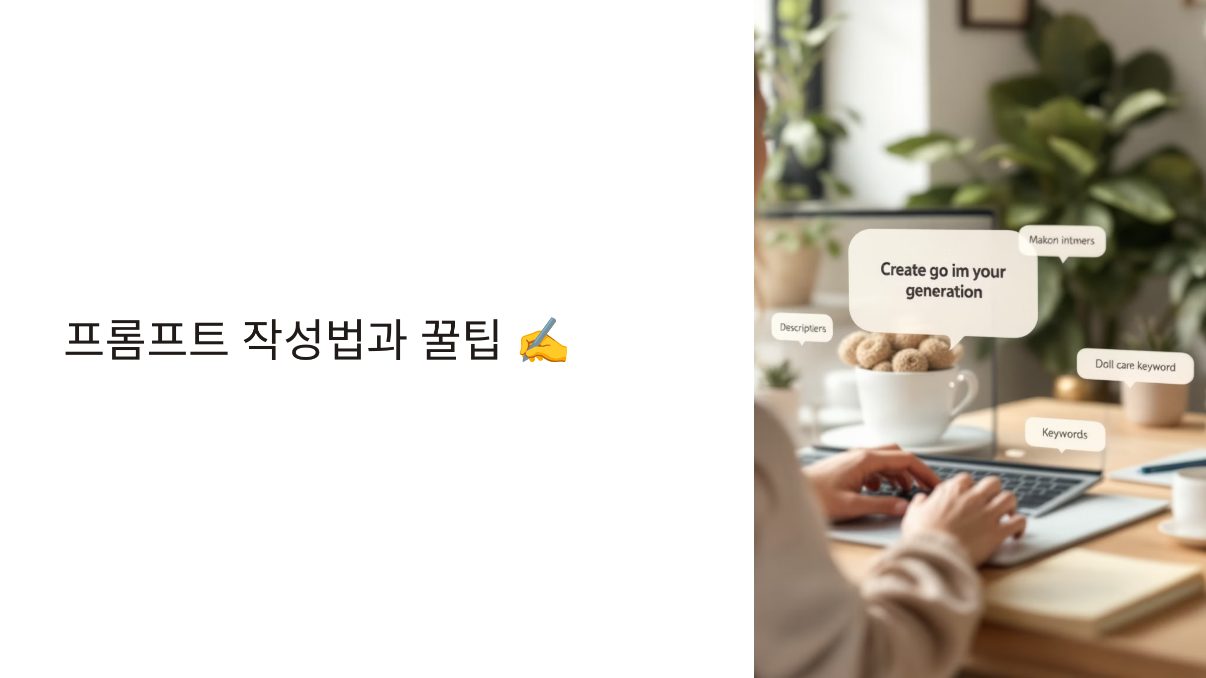 ✍️ 다음은 프롬프트 작성법과 꿀팁이에요! 어떤 단어, 구조, 표현을 써야 더 멋진 이미지를 뽑을 수 있을지 알려드릴게요.👇
