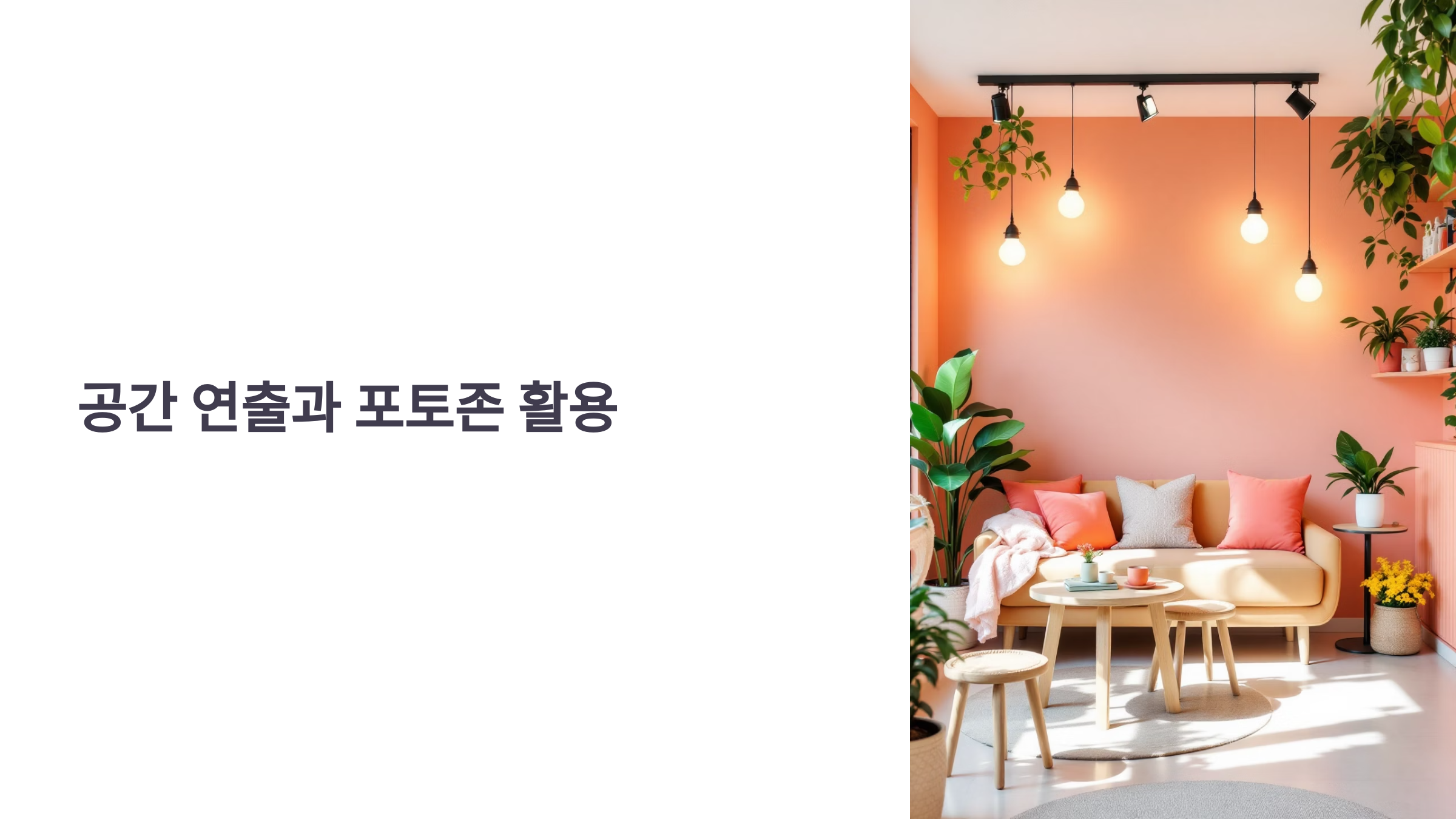 다음은 카페에 들어오는 순간 '와!' 하는 경험을 주는 비주얼 전략! 공간 연출과 포토존에 대해 알아볼게요. 📷
