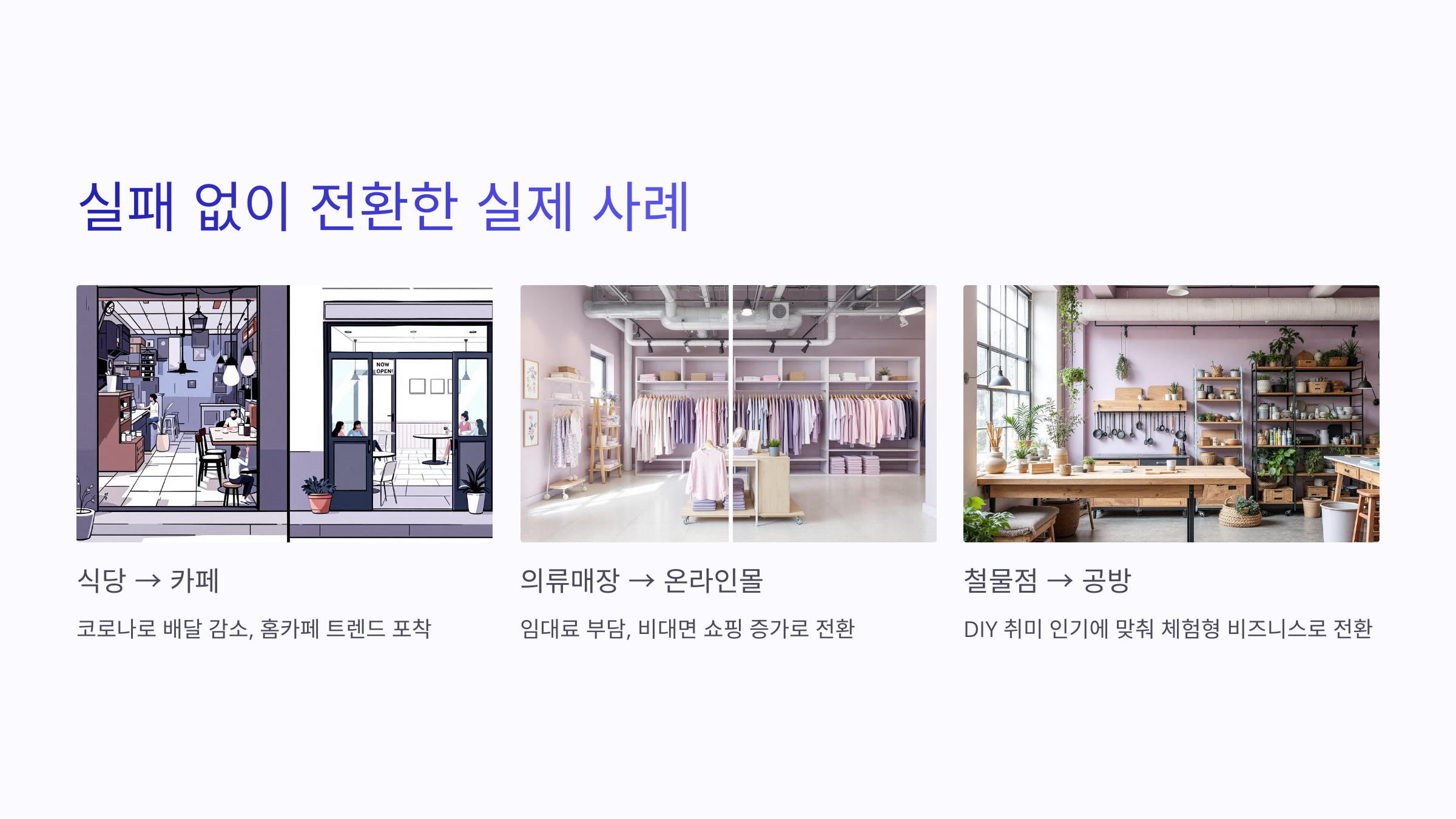 이런 사례들이 보여주는 건, 새로운 업종이더라도 기존 경험과 자원을 연결하면 충분히 살아남을 수 있다는 거예요. 고객 니즈에 맞게 변화한 것뿐이에요.