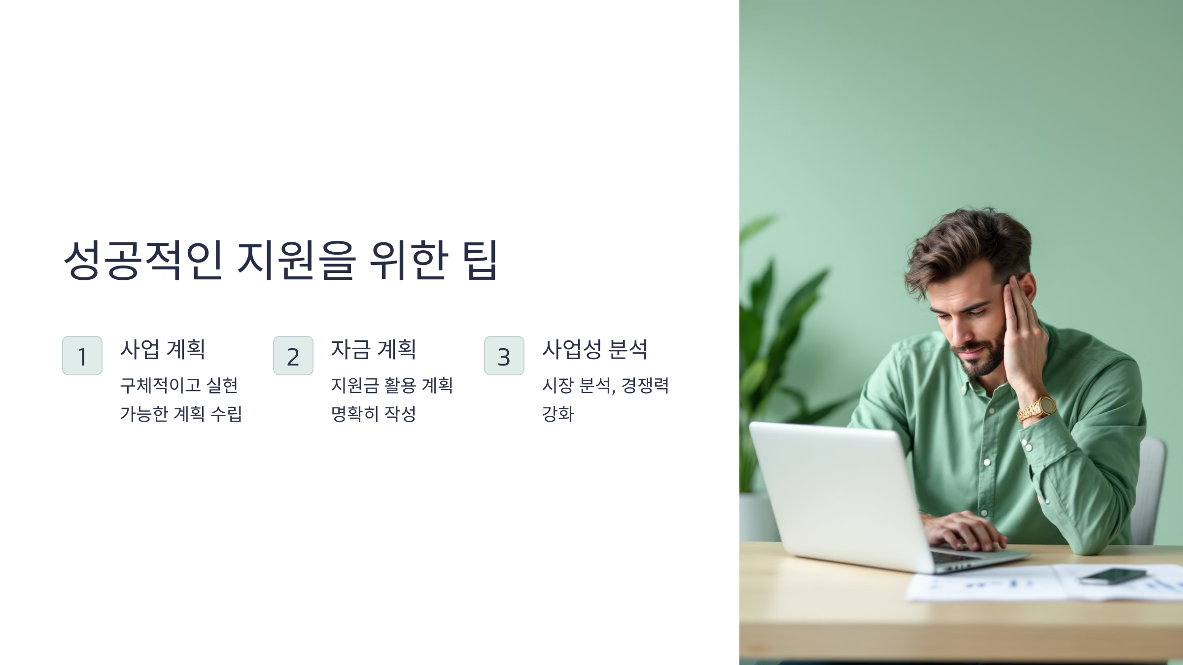 1. 정확한 자료 준비: 신청 시 필요한 서류를 빠짐없이 준비하세요. 특히 사업 계획서의 경우, 논리적이고 설득력 있게 작성하는 것이 중요해요.