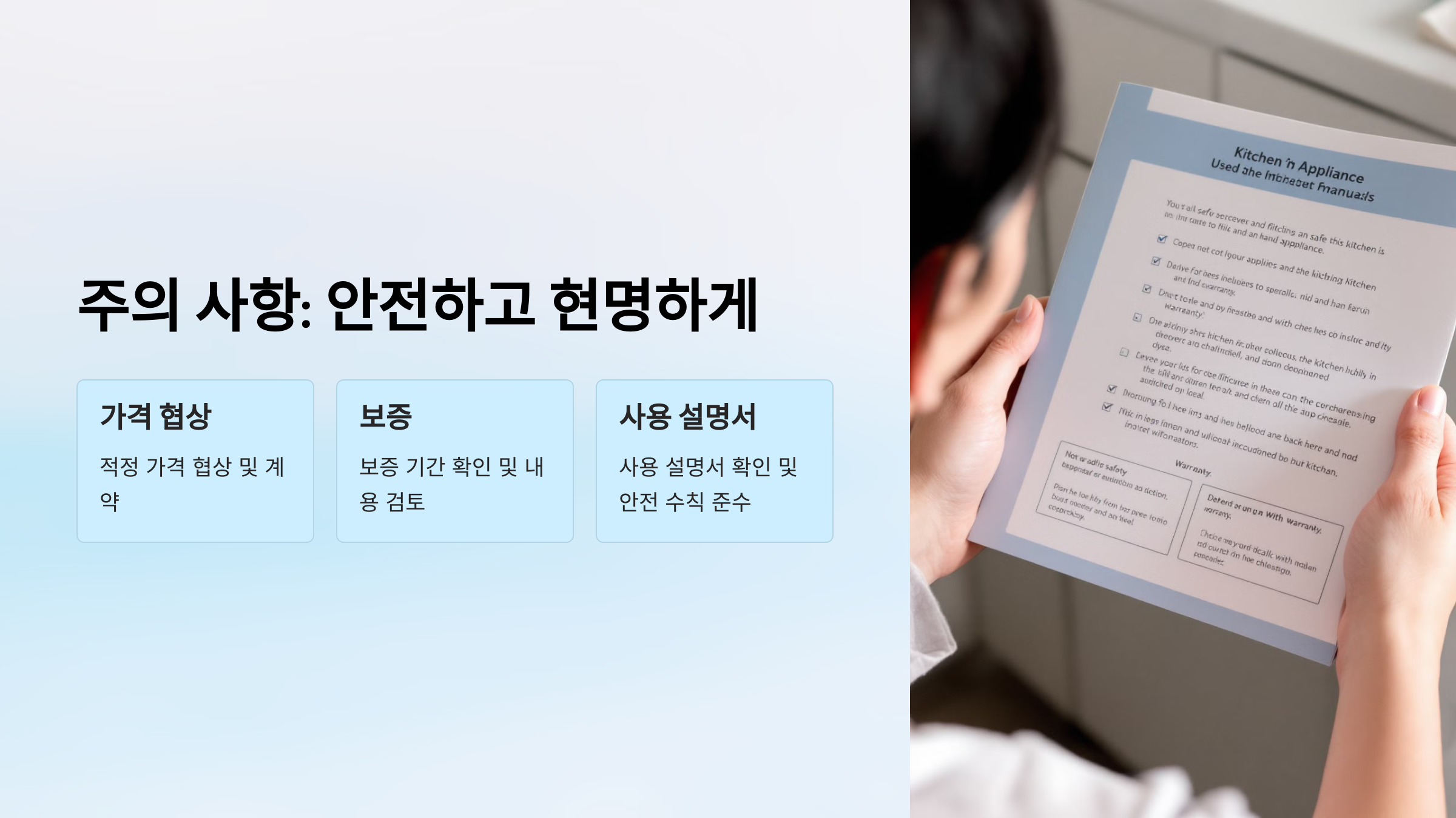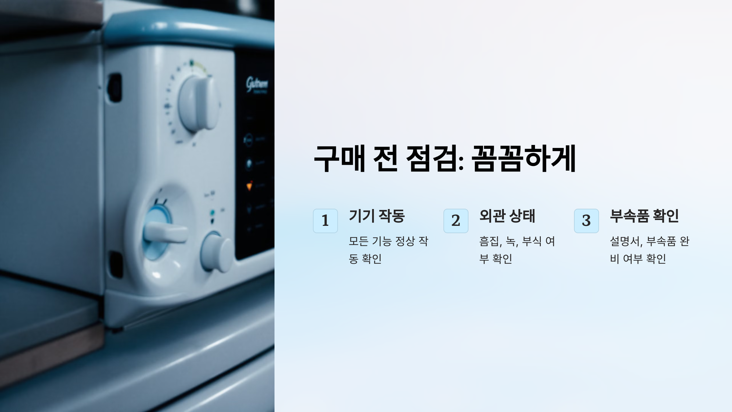 중고 주방 기기를 구매하기 전에는 반드시 상태를 철저히 점검해야 해요. 먼저 외관 상태를 확인하세요. 큰 손상이나 녹, 균
