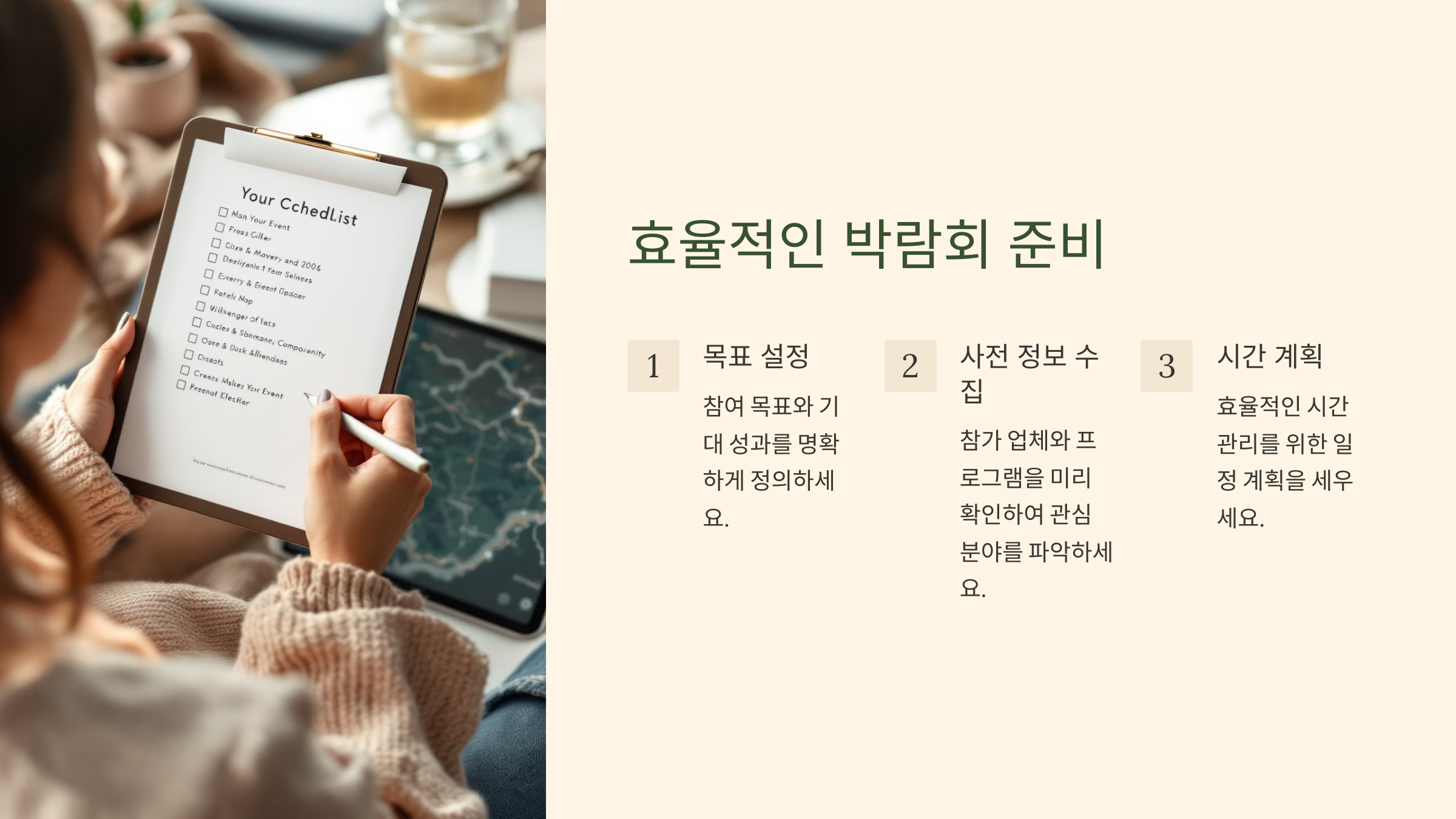 박람회에 효과적으로 참여하기 위해서는 사전 준비가 매우 중요해요. 먼저, 행사 일정과 장소를 정확히 파악하고 참가 등록을 해야 해요. 특히 인기 있는 박람회의 경우 조기 마감될 수 있으니 빠르게 등록하는 것이 좋아요.