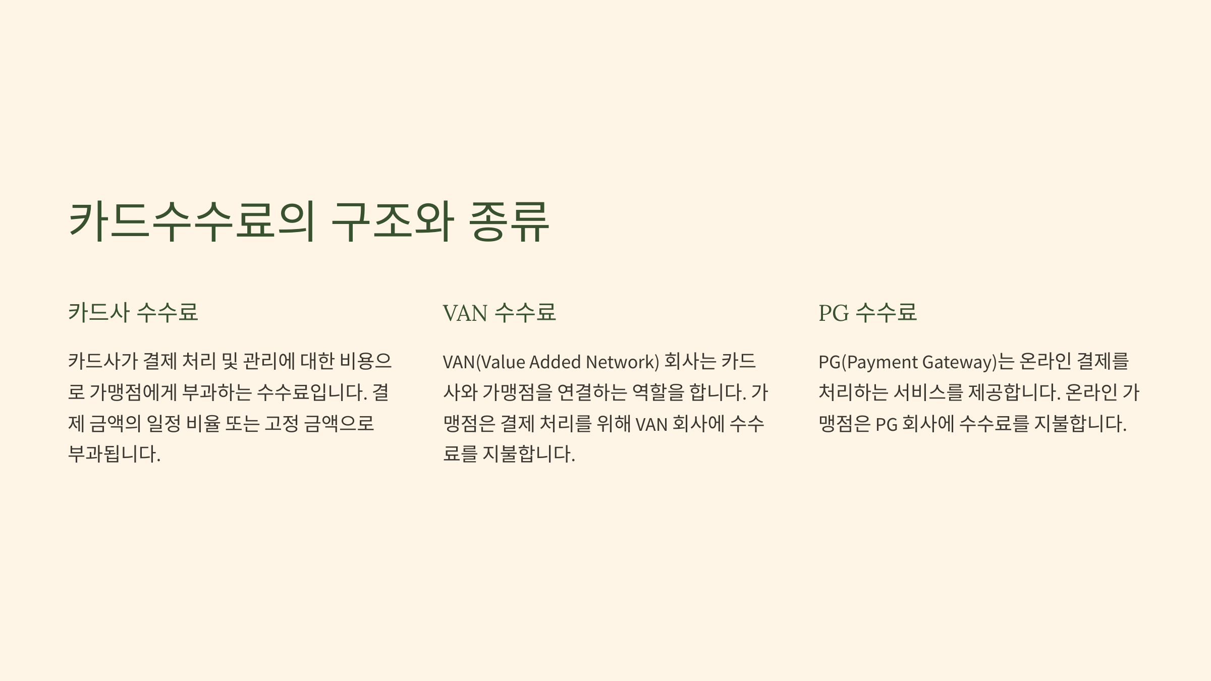 1. 가맹점 수수료: 카드 결제를 제공하기 위해 가맹점이 카드사에 지급하는 기본 수수료예요.