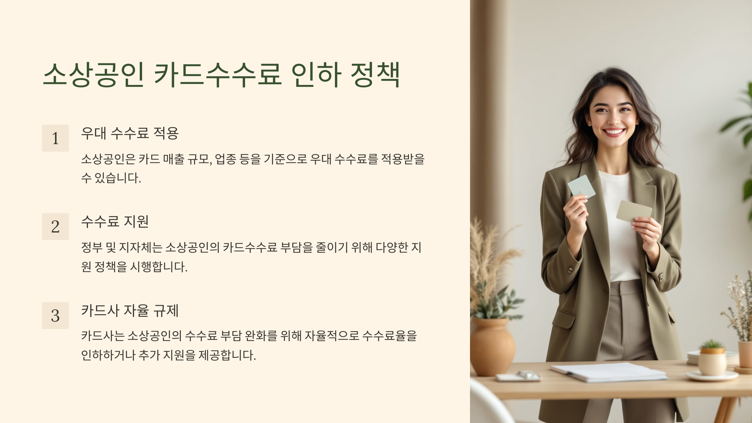 정부는 소상공인들의 부담을 줄이기 위해 카드수수료 인하 정책을 시행하고 있어요. 이를 통해 일정 매출 이하의 소상공인들은 낮은 수수료율을 적용받을 수 있답니다.