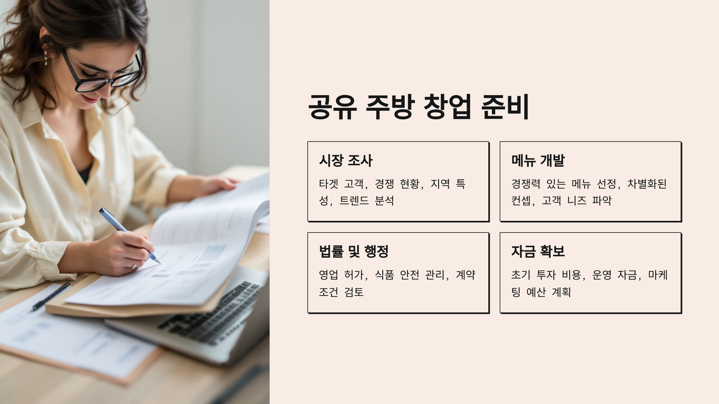 공유 주방 창업을 준비하려면 몇 가지 주요 사항을 고려해야 해요. 첫째, 타겟 고객과 음식 아이템을 명확히 정하는 것이 중요해요. 어떤 음식을 제공할지, 그리고 이를 누구에게 판매할지에 따라 비즈니스 전략이 크게 달라지기 때문이에요.