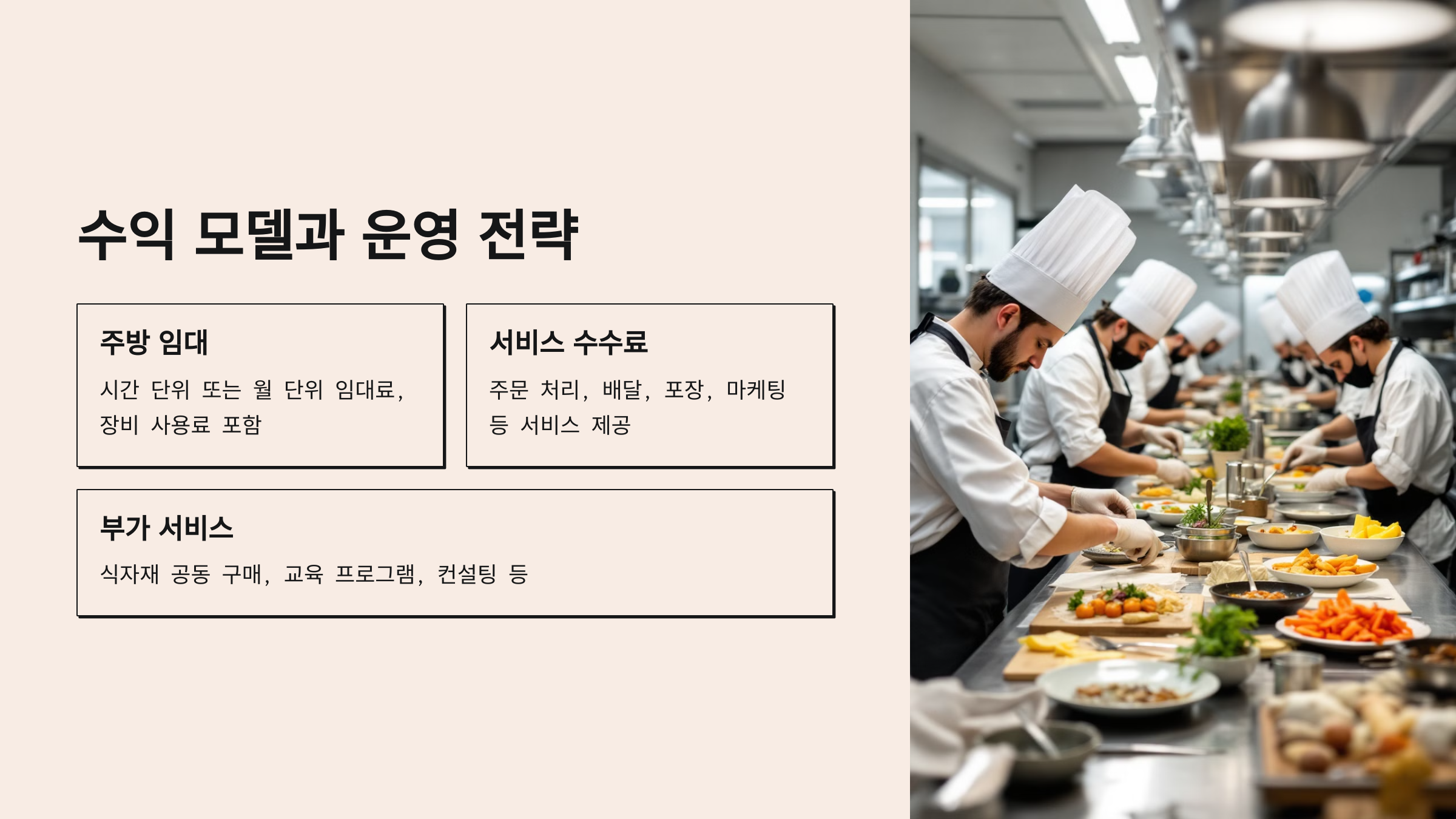 공유 주방 창업의 수익 모델은 배달 서비스, 테이크아웃, 그리고 팝업 레스토랑 운영 등으로 나뉘어요. 이 중 배달 서비스는 가장 흔한 모델이며, 현재 공유 주방의 핵심 수익 창출 방식이기도 해요.