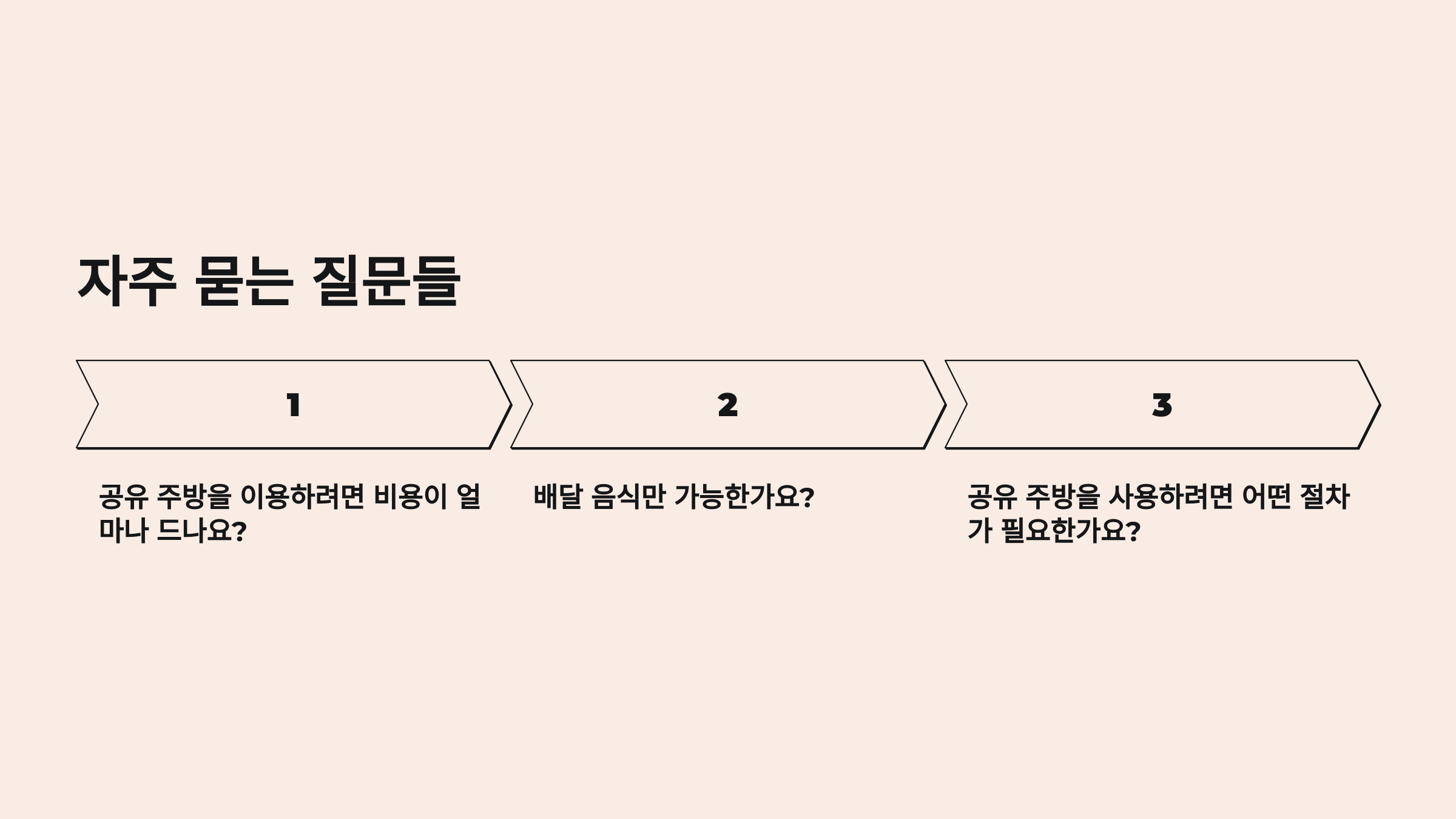 A3. 대부분의 공유 주방은 이용 계약서를 작성한 후, 위생 교육을 받고 시간 예약제로 주방을 사용하게 돼요. 필요한 경우 영업 신고도 진행해야 해요.