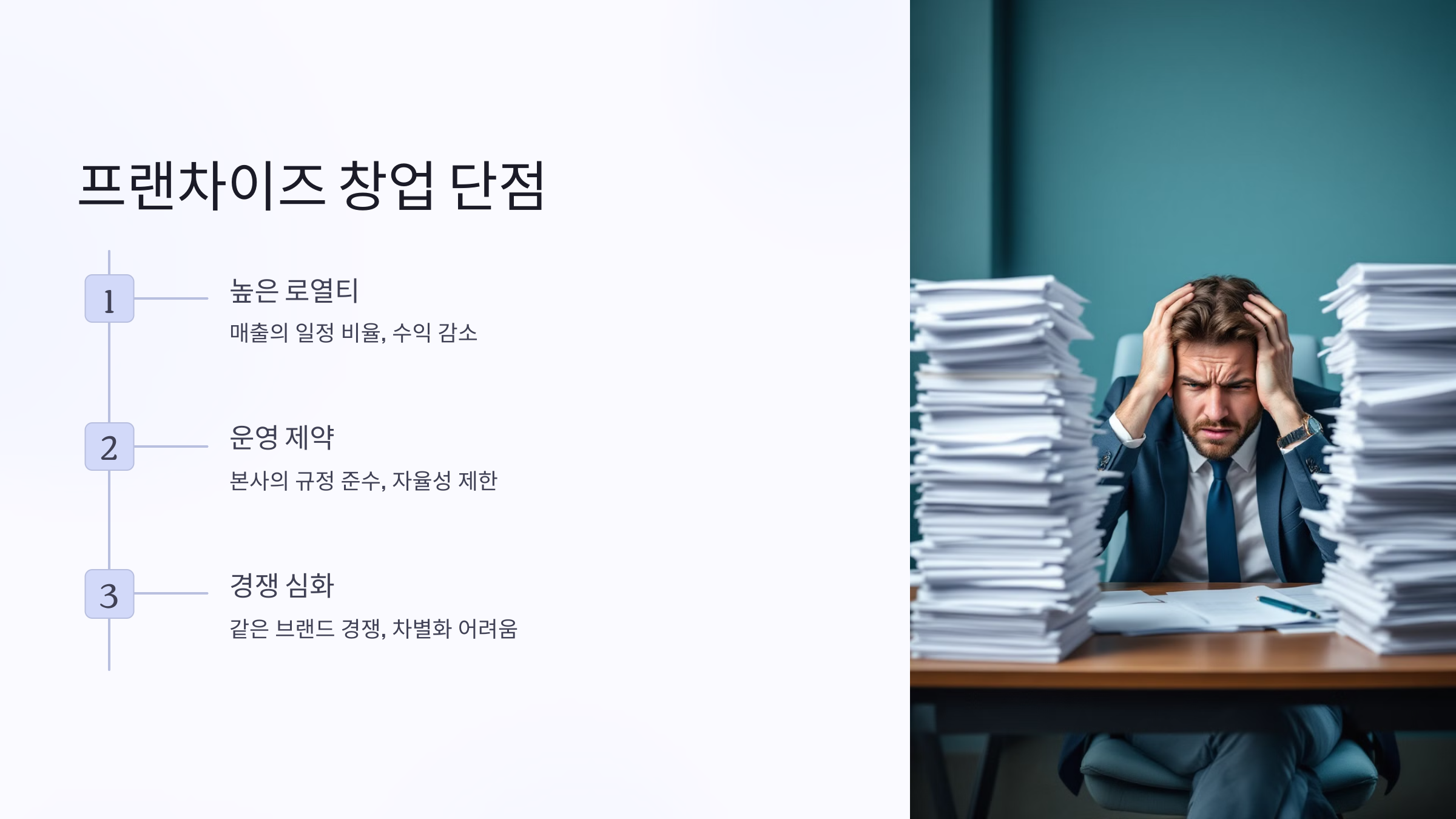 - 프랜차이즈 창업: 본사의 운영 지침을 따라야 하므로 자율성이 제한될 수 있어요. 상품 구성과 가격 책정에도 제한이 있을 수 있어요.