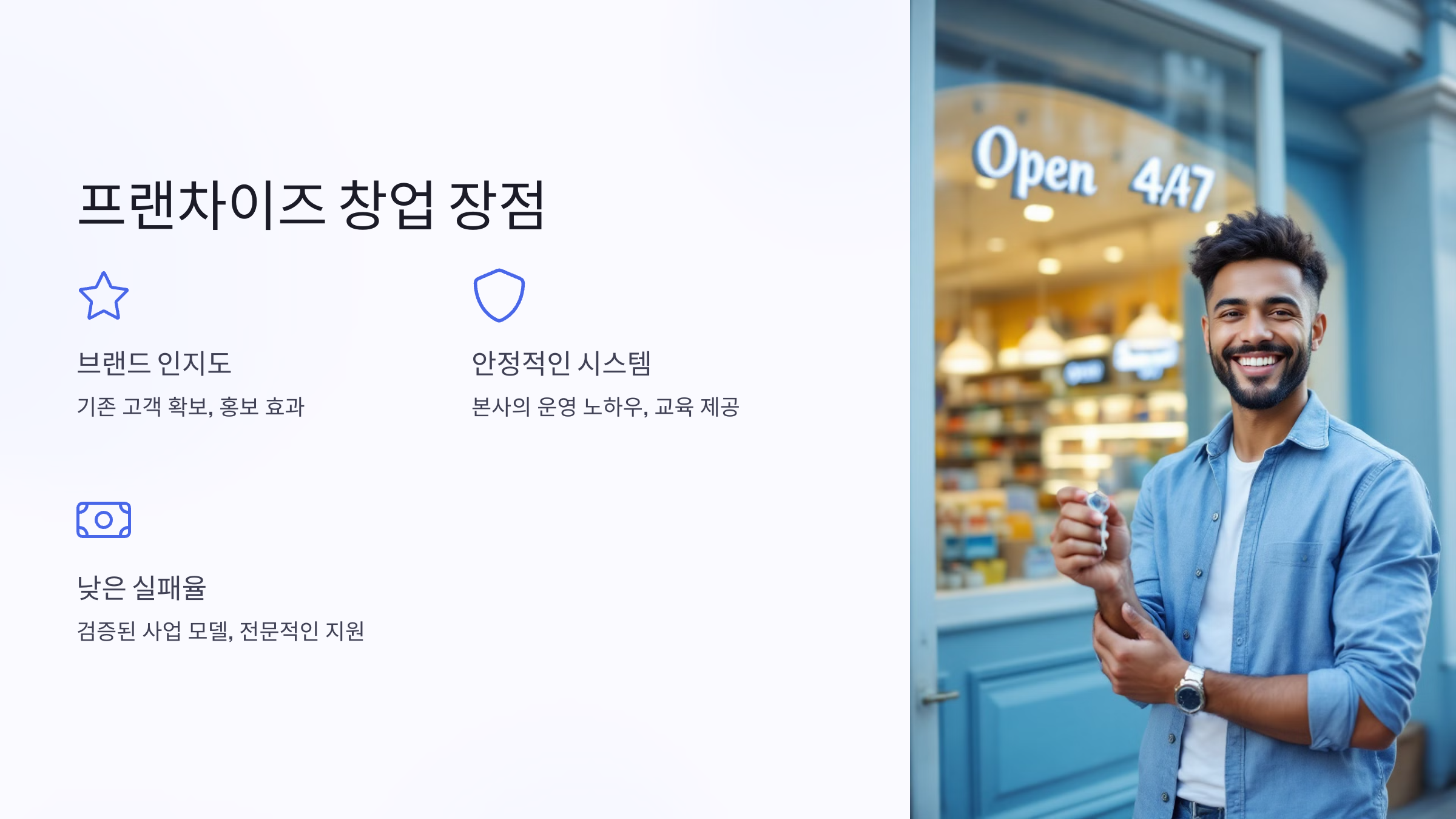 무인 편의점 프랜차이즈 창업은 개인이 독립적으로 창업하는 것보다 많은 이점을 제공해요. 특히 본사의 체계적인 지원과 운영 경험을 바탕으로 초보 창업자도 안정적인 매장 운영을 시작할 수 있답니다. 아래는 주요 장점을 정리한 내용이에요: