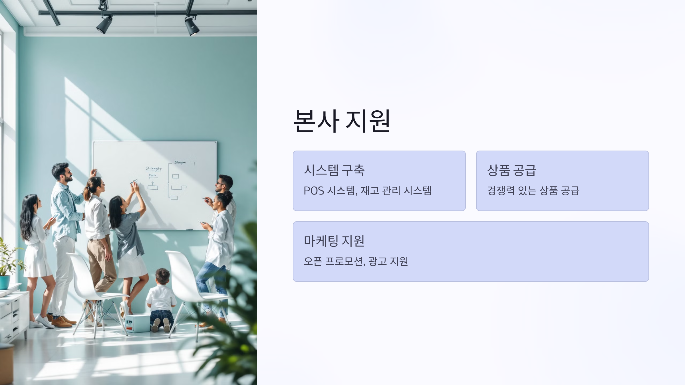 매장의 분위기는 고객 경험에 중요한 영향을 미쳐요. 본사는 브랜드에 맞는 매장 디자인을 제안하고, 표준화된 인테리어를 설치하도록 지원해요. 이를 통해 가맹점이 브랜드 정체성을 유지하면서도 전문적인 이미지를 가질 수 있답니다.