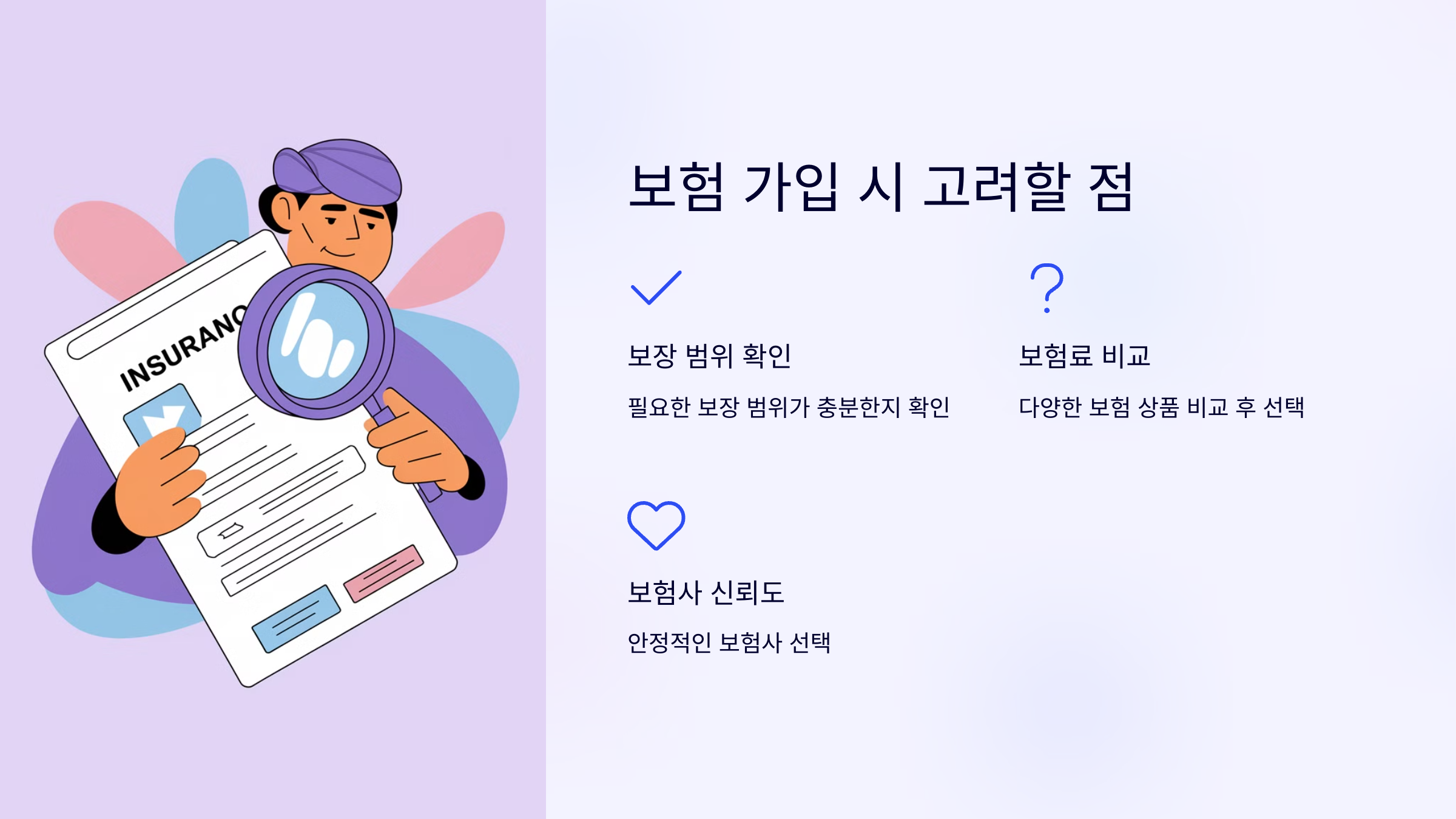 마지막으로, 보험 계약서를 꼼꼼히 읽고 보장 내용과 제외 조건을 확인하는 것이 매우 중요해요. 잘못된 정보로 인해 나중에 보상을 못 받는 상황을 피하려면 세부 약관을 반드시 숙지하세요.