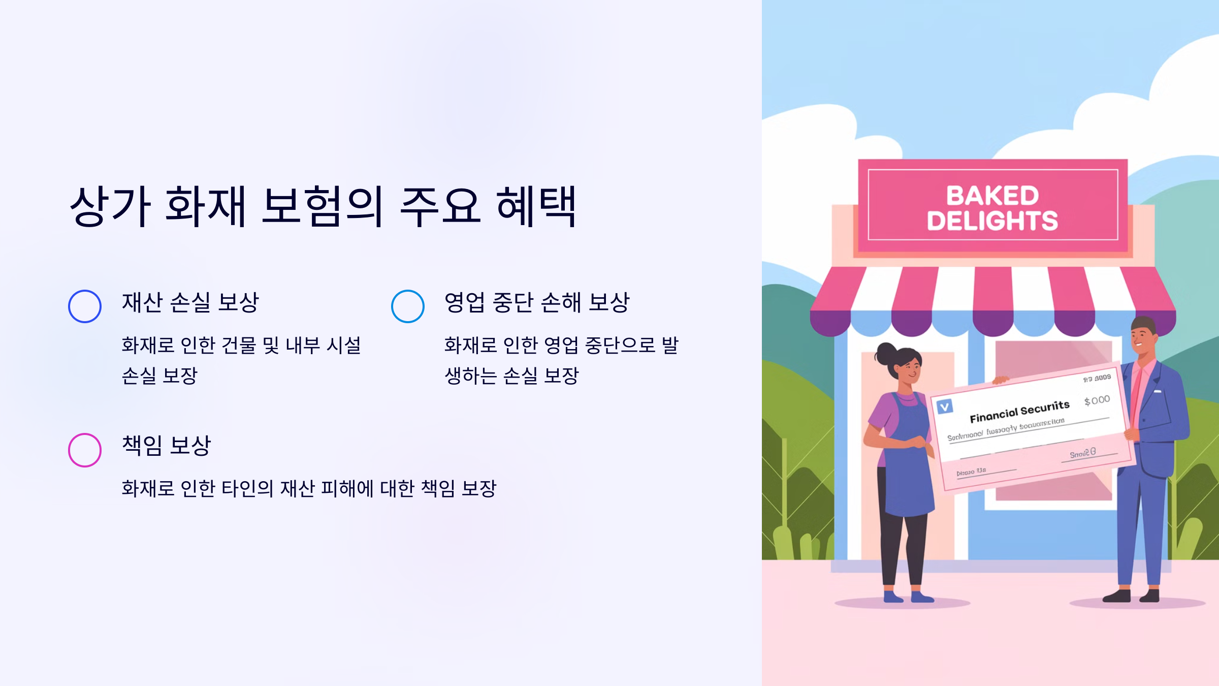 이 서비스는 복구에 소요되는 시간과 비용을 줄여 주기 때문에 상가를 다시 운영하기까지의 시간을 단축시키는 데 도움이 돼요. 예를 들어, 내부 인테리어 수리, 전기 설비 복구, 상품 재고 보충 등에 대한 비용을 보험금으로 처리할 수 있답니다.
