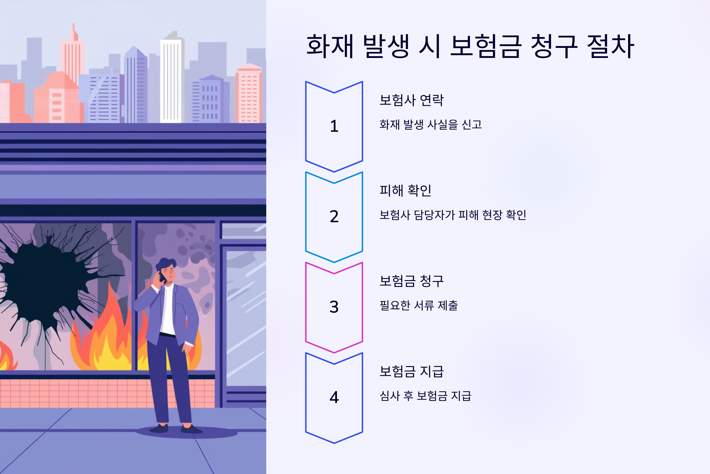 화재가 진압된 후 보험사에 즉시 사고를 접수해야 해요. 보험사 고객센터나 담당 보험 설계사를 통해 사고를 신고하면, 보험사에서 피해 조사 및 청구 절차를 안내해 줘요.