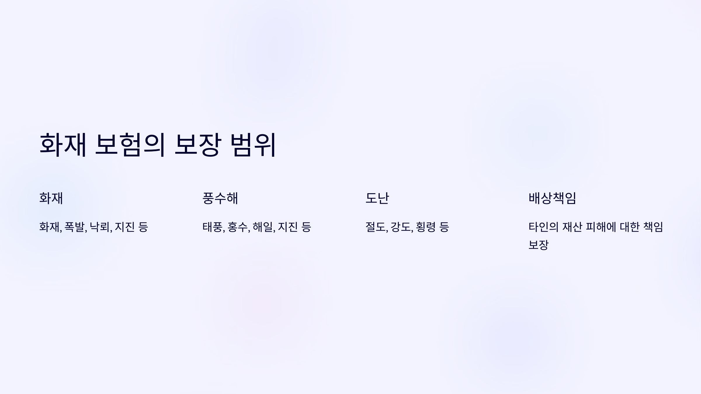 화재 보험의 보장 범위는 크게 두 가지로 나눌 수 있어요. 기본적으로 화재로 인해 발생한 물적 피해에 대한 보상과, 사고로 인해 추가적으로 발생한 배상 책임 보장이 포함될 수 있어요. 구체적인 보장 항목은 보험사와 선택한 특약에 따라 달라지므로 가입 전 반드시 확인해야 해요.