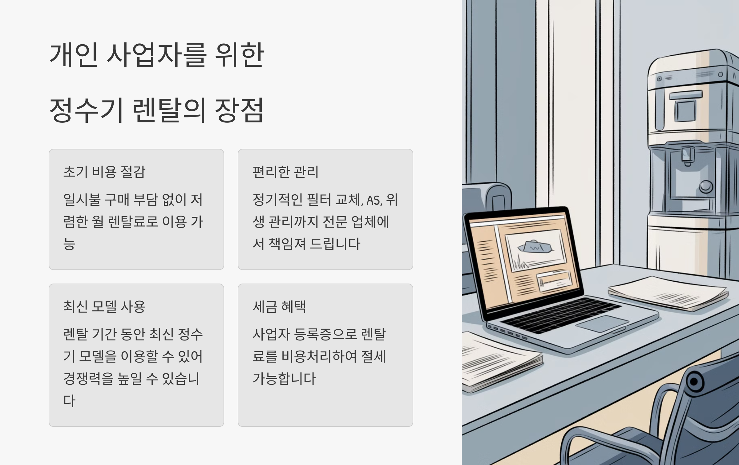 정수기를 구매하려면 수십만 원에서 많게는 수백만 원의 초기 비용이 발생해요. 하지만 렌탈 서비스를 이용하면 월 렌탈료만 지불하면 되기 때문에 초기 자금을 절약할 수 있어요. 이는 특히 예산이 한정된 개인사업자에게 큰 장점이에요.