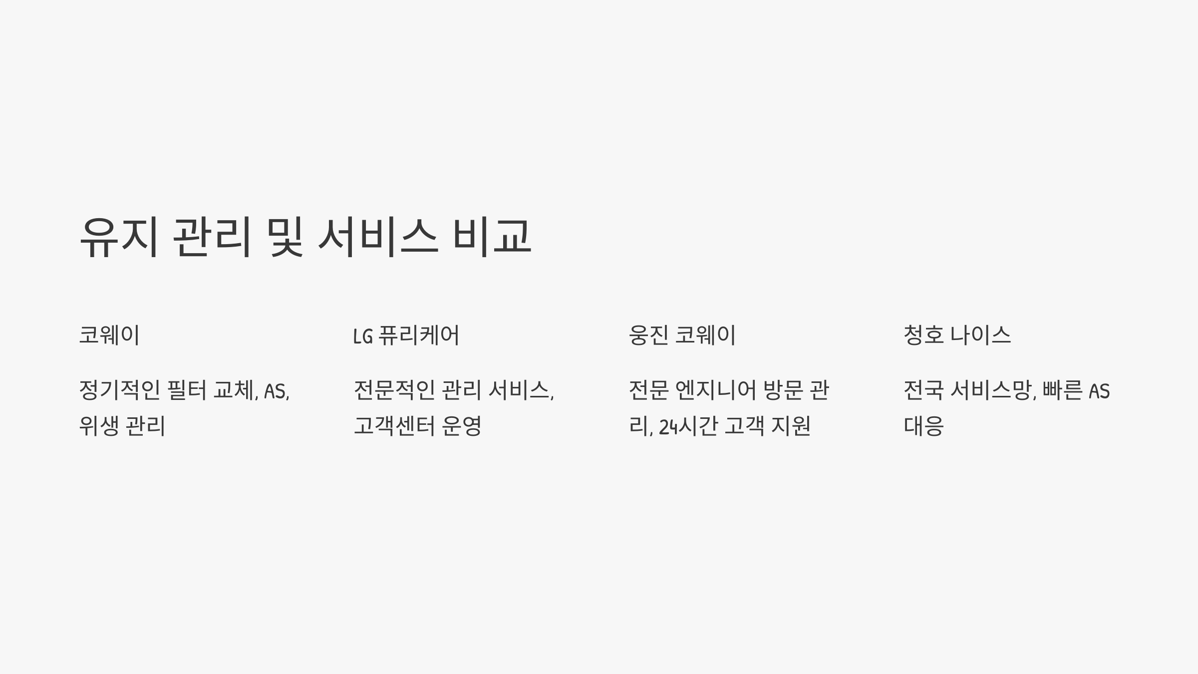 정수기 렌탈 서비스에서 가장 중요한 요소 중 하나는 유지 관리예요. 필터 교체, 내부 청소, 고장 수리 등의 서비스는 정수기를 항상 최상의 상태로 유지하기 위해 필수적이랍니다. 아래는 주요 브랜드의 유지 관리 서비스 특징을 비교한 내용이에요.