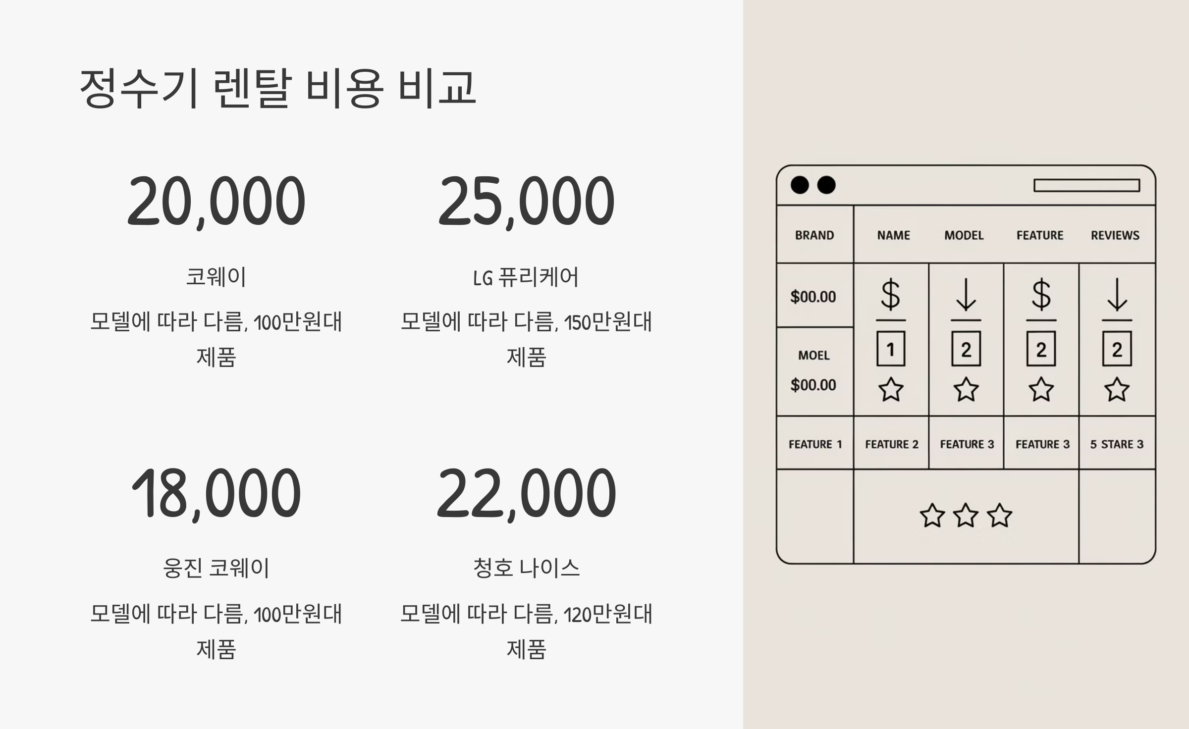정수기 렌탈 비용은 브랜드와 모델, 추가 옵션, 계약 기간 등에 따라 다르게 책정돼요. 아래는 주요 브랜드와 모델별 렌탈 비용 비교표예요: