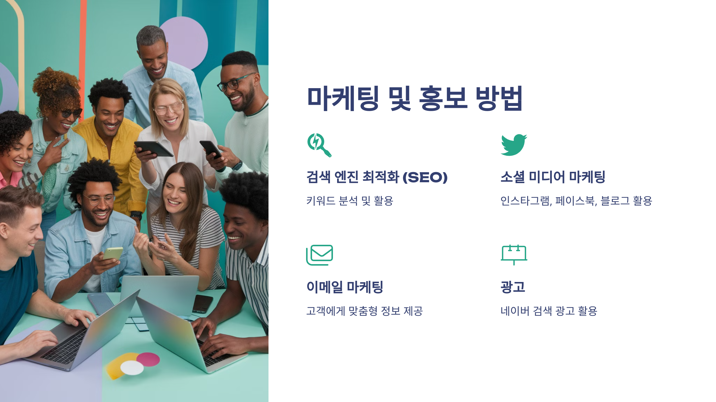 인스타그램, 페이스북, 틱톡 등 소셜 미디어 플랫폼을 활용해 홍보하세요. 특히 이미지와 영상 콘텐츠는 고객의 관심을 끌기에 효과적이에요.