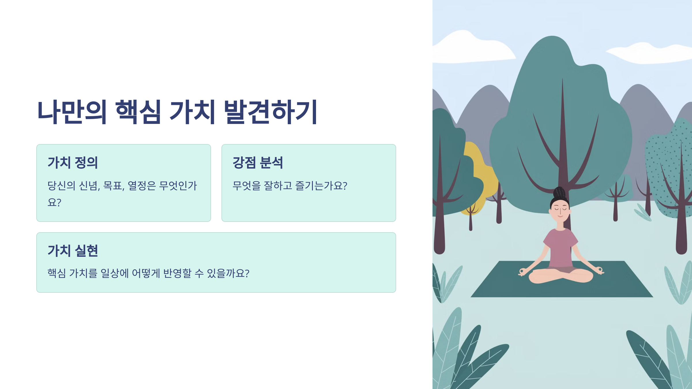 셀프 브랜딩의 시작은 자신이 누구인지 깊이 이해하는 데서 출발해요. 먼저, 자신이 가진 강점, 약점, 그리고 열정을 파악해보세요. 자신이 좋아하는 것과 잘하는 것을 교차시키면, 자신만의 독창적인 핵심 가치를 찾을 수 있을 거예요.